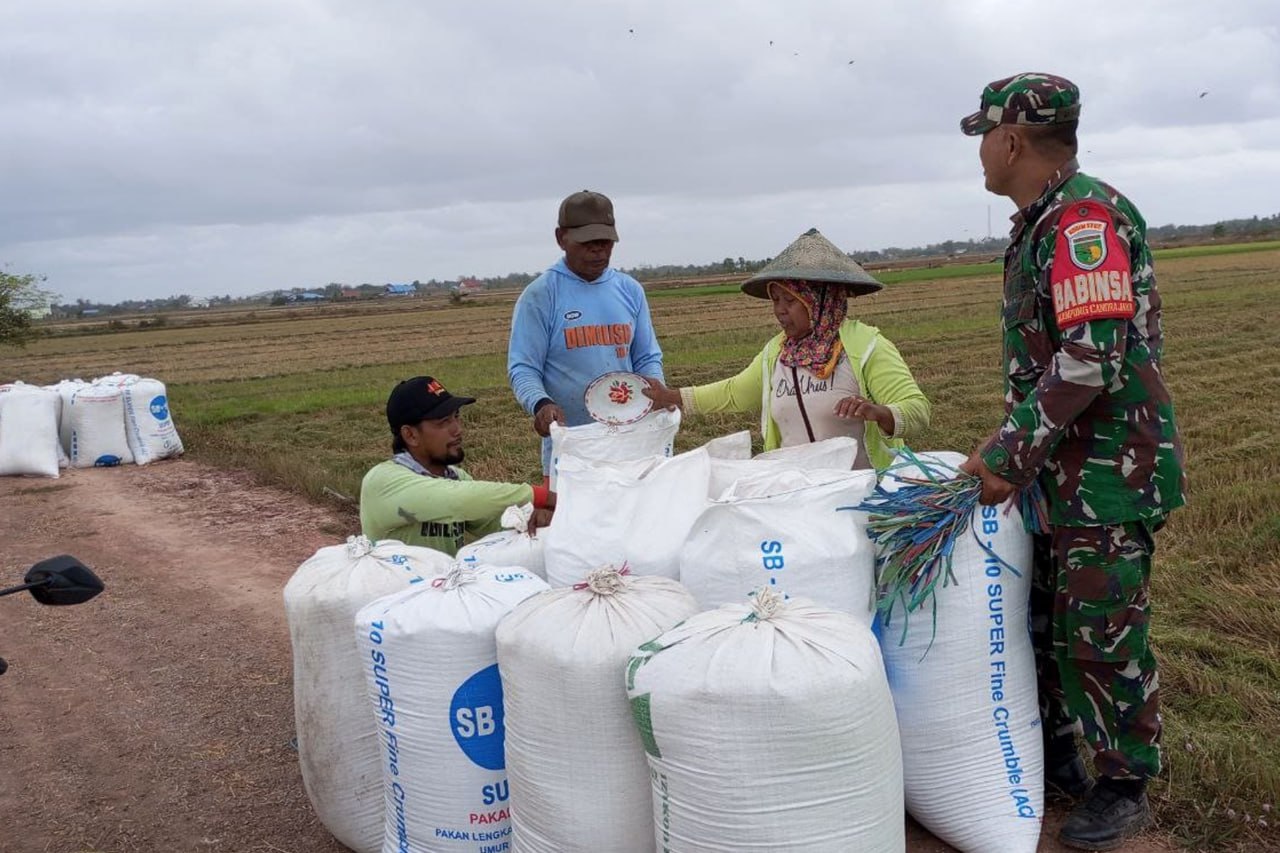 Babinsa Koramil 1707-05/Merauke Kodim 1707/Merauke Sertu Muhamad Arif membantu keluarga Bapak Slamet Riyadi yang merupakan salah satu petani Kampung Candra Jaya Distrik Kurik Kabupaten Merauke - Papua Selatan dalam memanen padi dilahan sawah miliknya. Kamis (31/8/23).