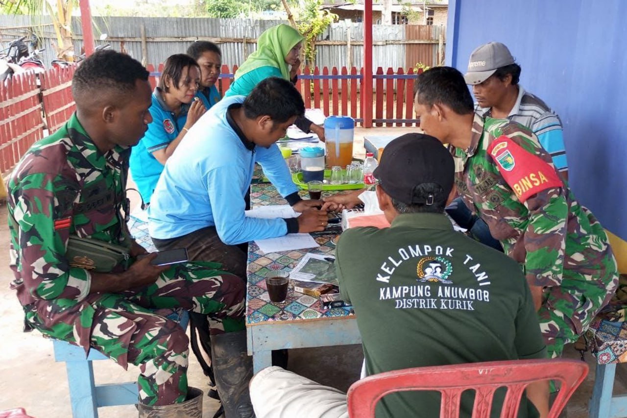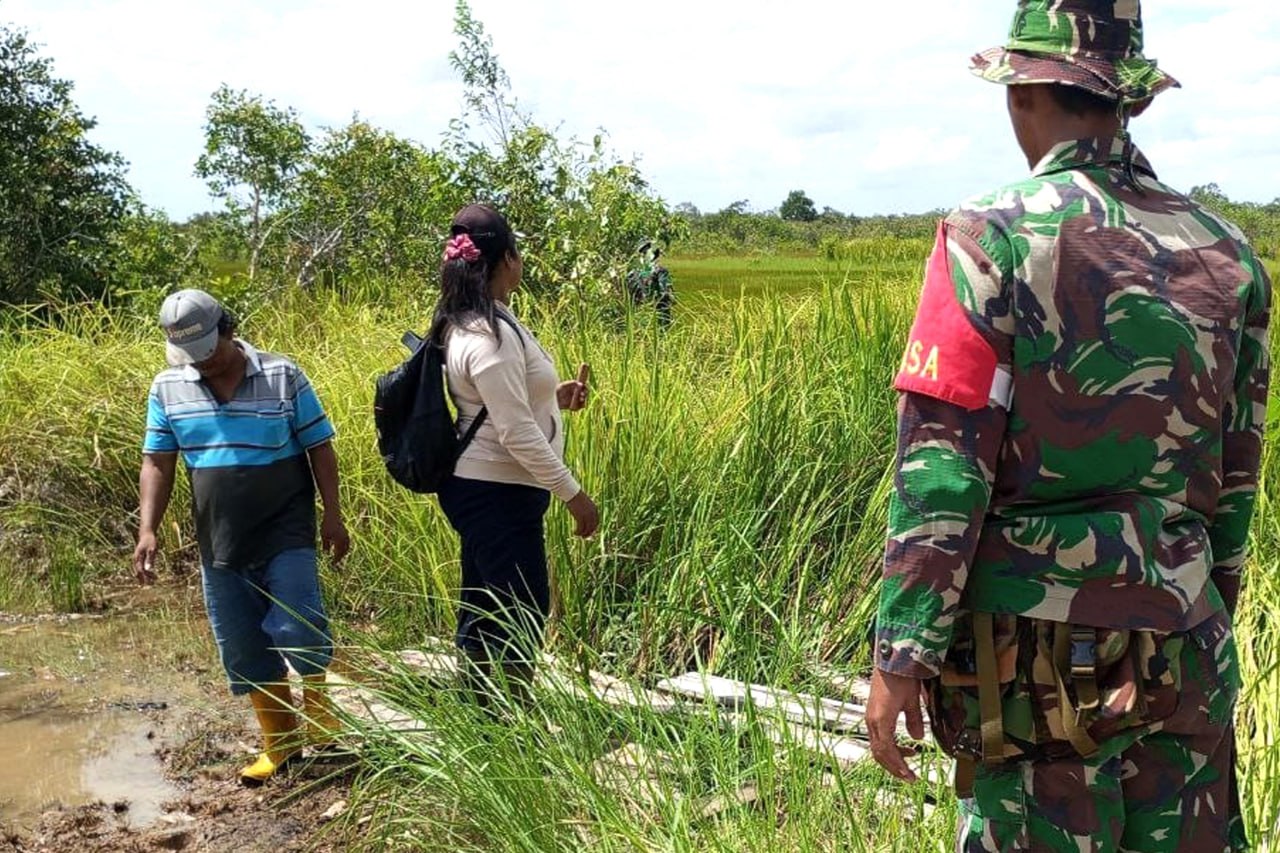 Babinsa Pos Ramil Kurik Koramil 1707-02/Merauke Kodim 1707/Merauke Sertu Asroni melaksanakan pendampingan kepada petugas Dinas Tanaman Pangan Hortikultura dan Perkebunan Kabupaten Merauke dalam melaksanakan survey Lahan Bero (lahan tidak tergarap dijadikan lahan produktif).