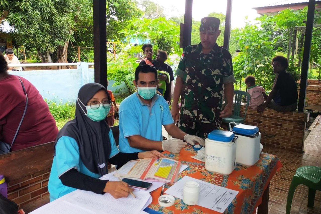 Babinsa Pos Ramil Semangga Koramil 1707-02/Merauke Kodim 1707/Merauke Pelda Suripto melaksanakan pendampingan sekaligus membantu kegiatan Pekan Imunisasi Nasional (PIN) di Kampung Waninggap nanggo yang digelar oleh Petugas Kesehatan Puskesmas Kuprik Distrik Semangga Kabupaten Merauke - Papua Selatan.