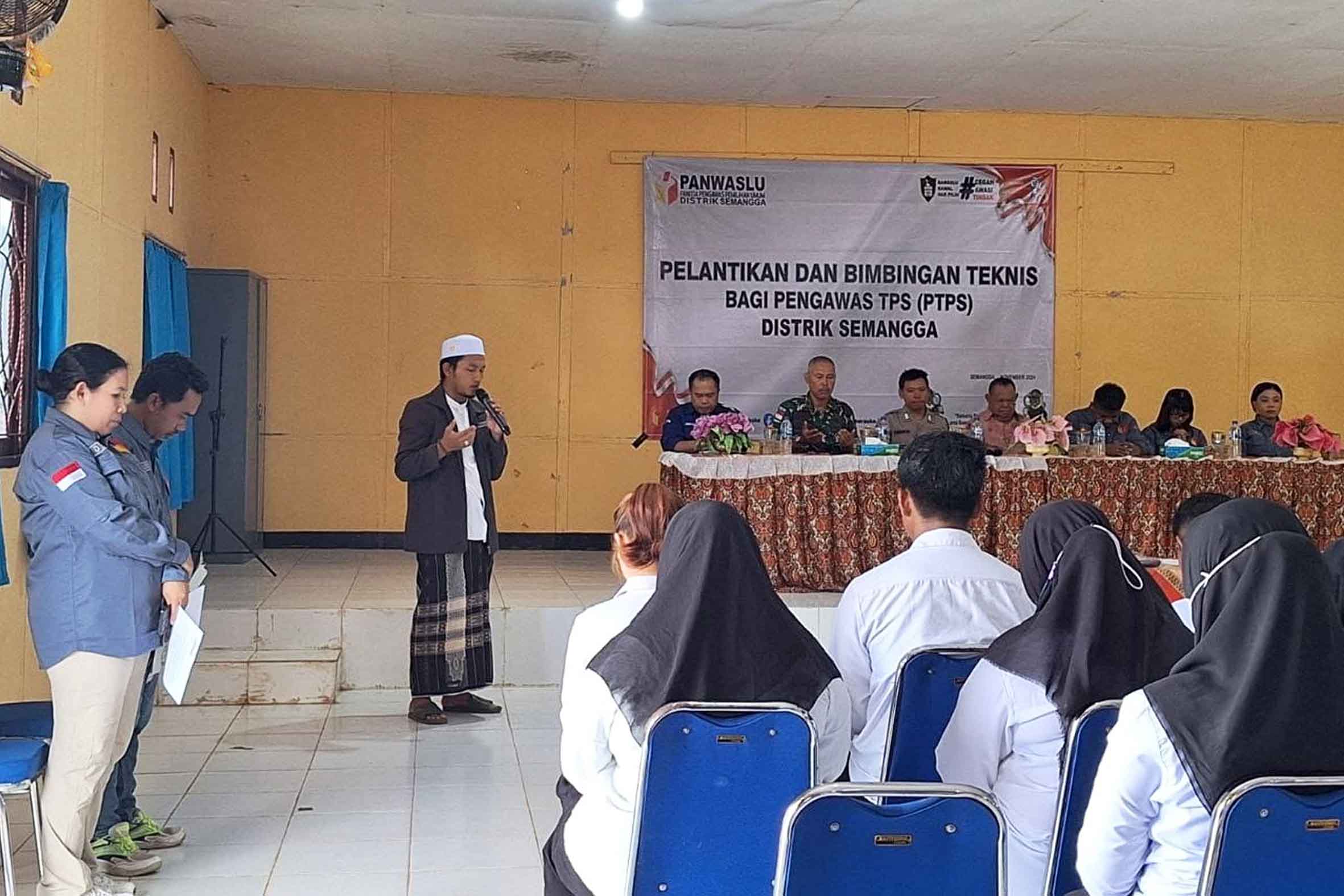 Dalam sambutannya Ketua Panwas Distrik Semangga mengajak kepada semua anggota pengawas TPS yang telah dilantik untuk bekerja dengan tulus ikhlas, bersungguh-sungguh, adil dan netral agar pelaksanaan Pemilihan Gubernur dan Wakil Gubernur serta Bupati dan Wakil Bupati di Distrik Semangga berjalan dengan baik, aman, tentram.