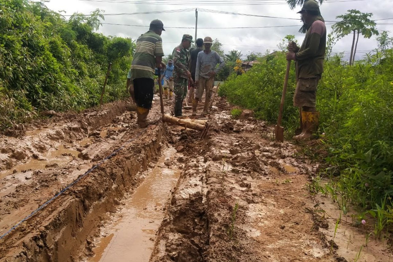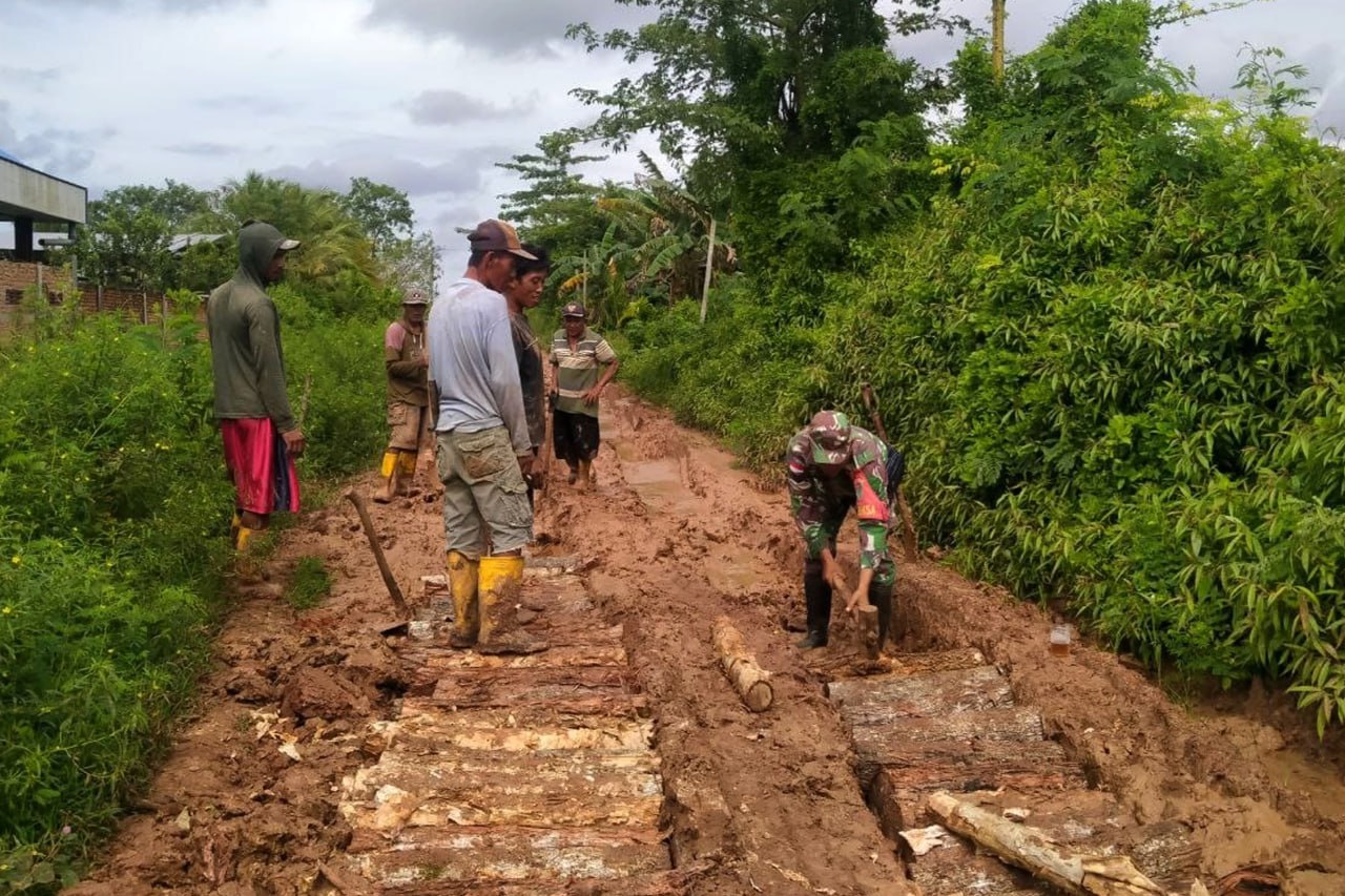"Dalam pelaksanaannya kegiatan kerja bhakti tersebut dilakukan secara gotong royong antara Babinsa dan Masyarakat setempat termasuk Masyarakat yang membuat produk batu bata. Sedangkan penimbunan jalan menggunakan potongan kayu balok yang disusun sesuai jalur roda kendaraan". jelasnya.