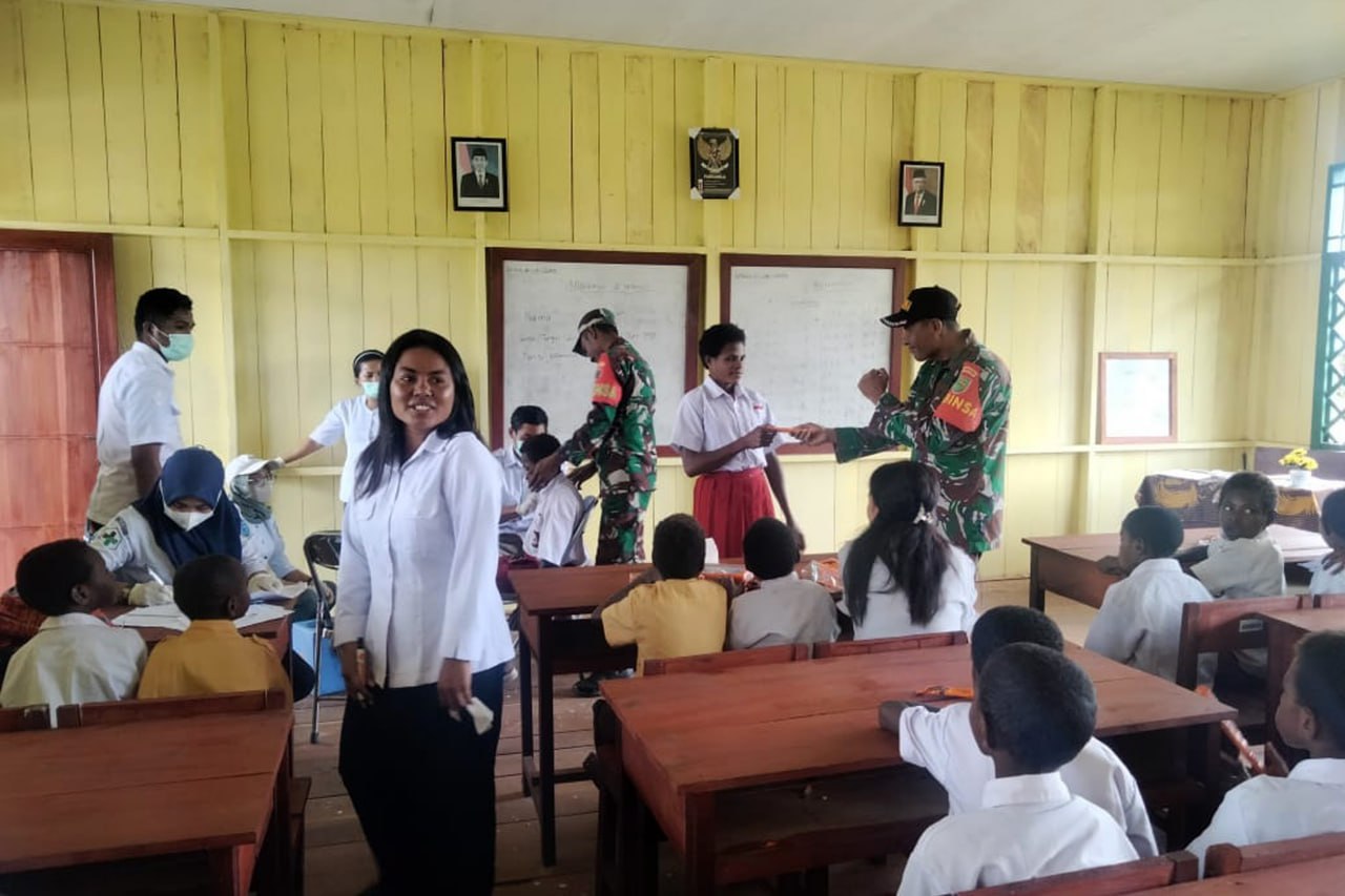 Dalam rangka ikut serta mewujudkan anak yang sehat, Babinsa Koramil 1707-20/Suator Kodim 1707/Merauke Serda Dominggus Tunay dan Serda Roy Nauw melaksanakan pendampingan dan membantu petugas kesehatan Puskesmas Daikot dalam menggelar imunisasi di SD Inpres Daikot Distrik Joutu Kabupaten Asmat - Papua Selatan.