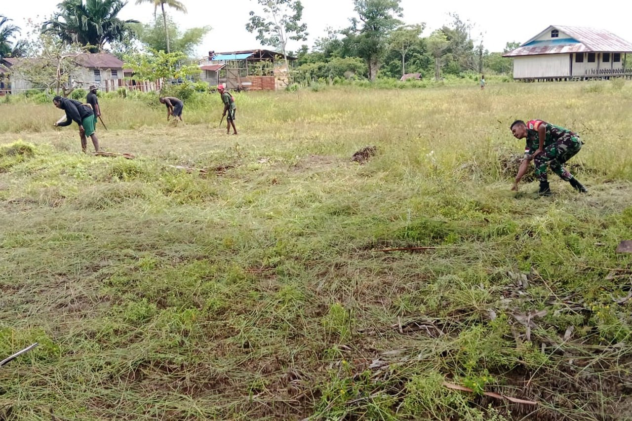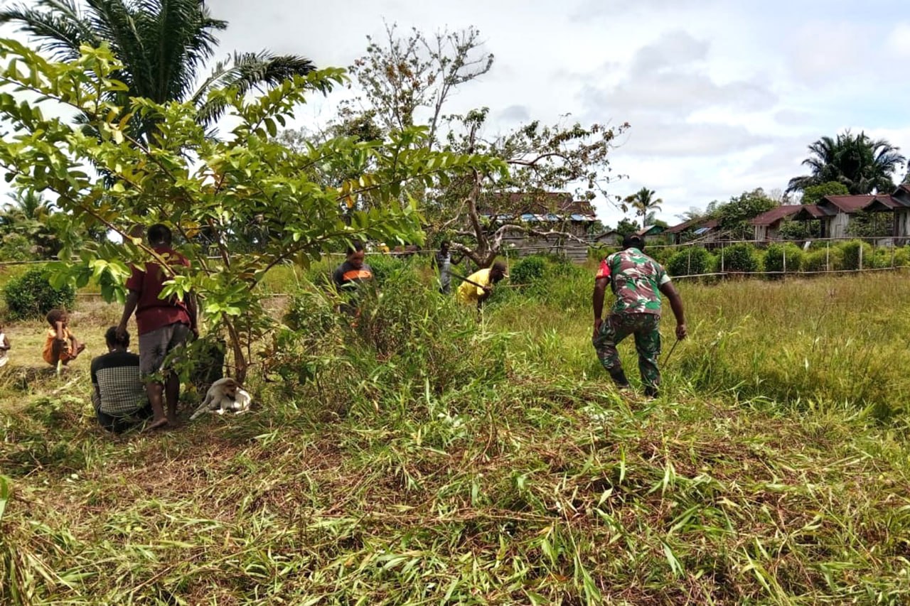 Dalam rangka menjaga lingkungan agar tetap bersih, Babinsa Pos Ramil Mabul Koramil 1707-20/Suator Kodim 1707/Merauke Serda Samuel Wamafma dan Serda Roi Naw bersama masyarakat Distrik Mabul melaksanakan kerja bhakti membersihkan rumput di halaman Gereja GGRIP Mabul Distrik Mabul Kabupaten Asmat. Senin (24/4/2023).