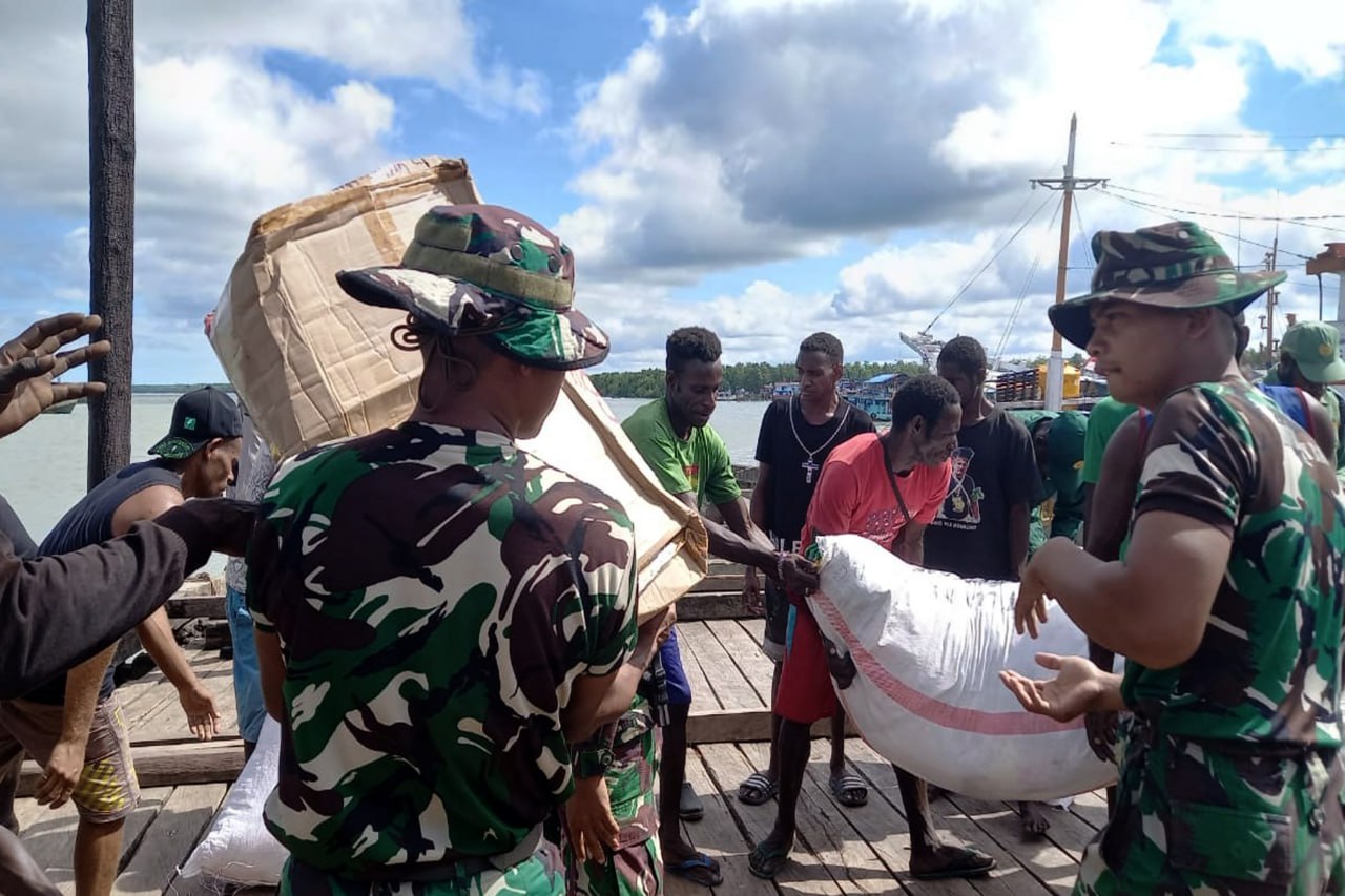 Bantuan sembako dan pakaian layak pakai dari Korem 174/ATW dan jajarannya untuk masyarakat korban kebakaran di Kampung Wanam tiba di Pelabuhan Wanam Distrik Ilwayab Kabupaten Merauke - Papua Selatan.