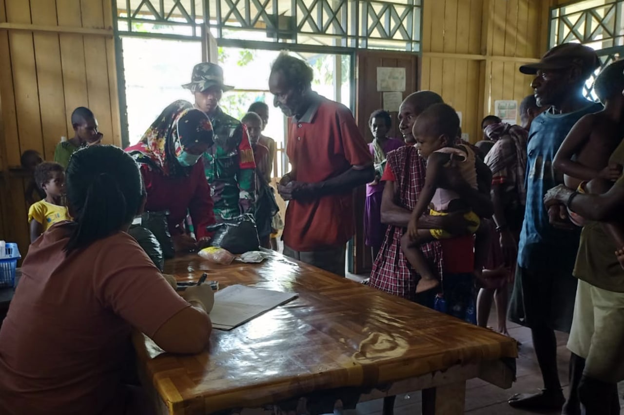 Bertempat di Gedung Puskesmas Pembantu (Pustu) Kampung Pupis Distrik Sawaerma Kabupaten Asmat, Babinsa Koramil 1707-12/Sawaerma jajaran Kodim 1707/Merauke yang dipimpin oleh Sertu Joko Tri melaksanakan pendampingan kepada petugas kesehatan Puskesmas Sawaerma dalam memberikan pelayanan kesehatan kepada masyarakat Kampung Pupis.