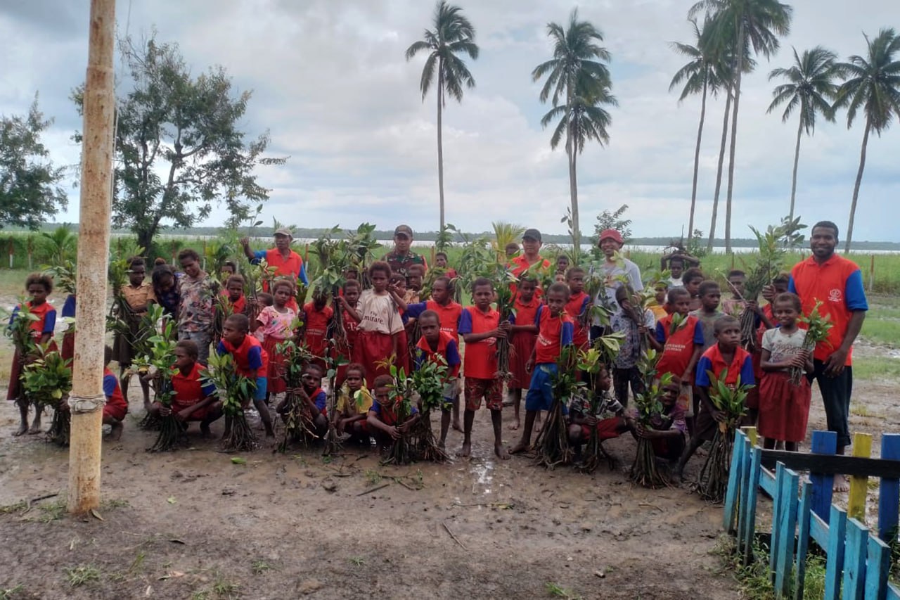 ▴kodim 1707/merauke▴ CEGAH TERJADINYA ABRASI, BABINSA KORAMIL KIMAAM BERSAMA SISWA-SISWI SD TANAM BAKAU