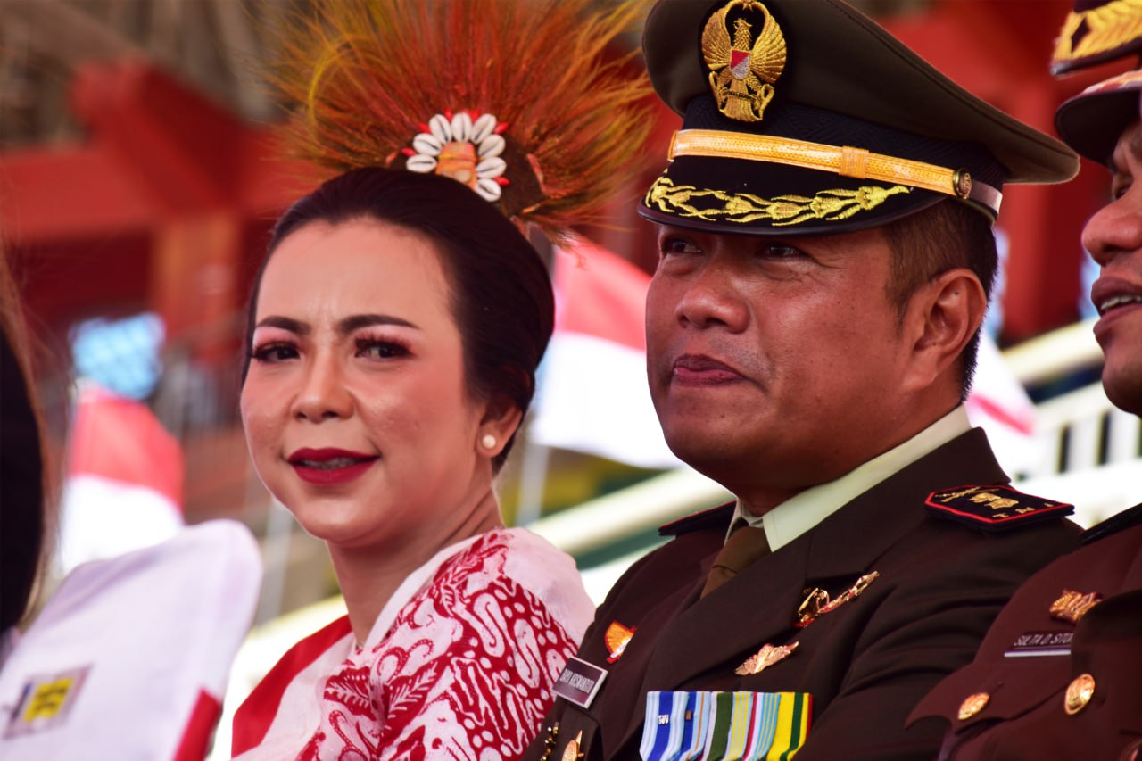 Komandan Kodim 1707/Merauke Letkol Inf Bayu Kriswandito, S.Hub. Int., M.H.I. dengan didampingi Ketua Persit KCK Cabang XVIII Kodim 1707 Merauke Ny. Nita Bayu Kriswandito mengikuti Upacara Detik Detik Proklamasi Kemerdekaan Republik Indonesia Tahun 2024 bertempat di Stadion Katalpal Jln. Peternakan Kelurahan Mopah Lama Kota Merauke Kabupaten Merauke - Provinsi Papua Selatan. Sabtu (17/8/24).