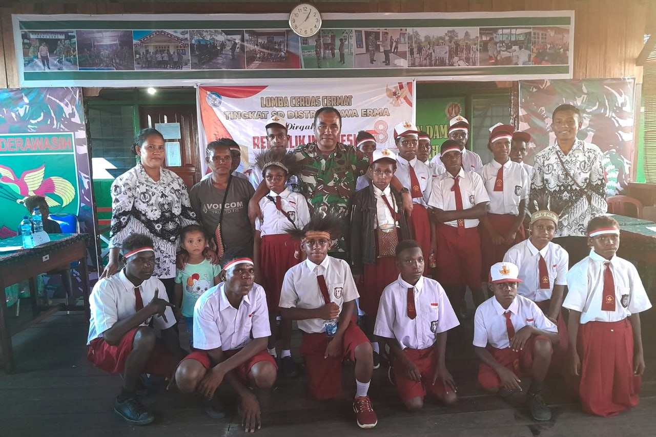 Komandan Koramil 1707-12/Sawaerma Kodim 1707/Merauke Kapten Inf Rony K. Retraubun membuka kegiatan lomba cerdas cermat tingkat Sekolah Dasar se-Distrik Sawaerma Kab. Asmat dalam rangka memeriahkan HUT Ke-78 Kemerdekaan Republik Indonesia Tahun 2023.