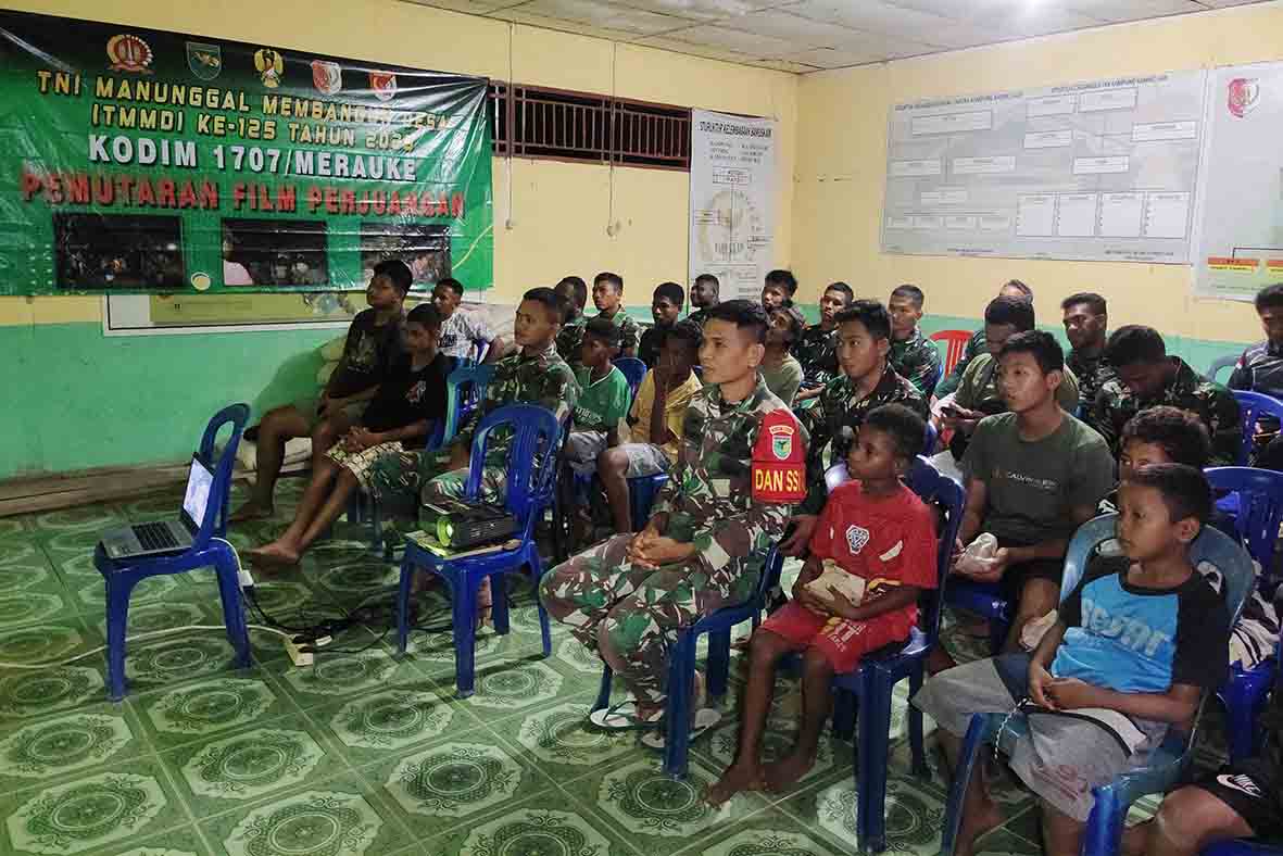 Personel Satgas TMMD Ke-125 Kodim 1707/Merauke, bersama masyarakat, menggelar nonton bareng (nobar) film perjuangan pada Sabtu malam, 9 Agustus 2025. Kegiatan ini bukan hanya hiburan, tetapi juga pengingat akan darah, air mata, dan pengorbanan para pahlawan untuk kemerdekaan Indonesia.