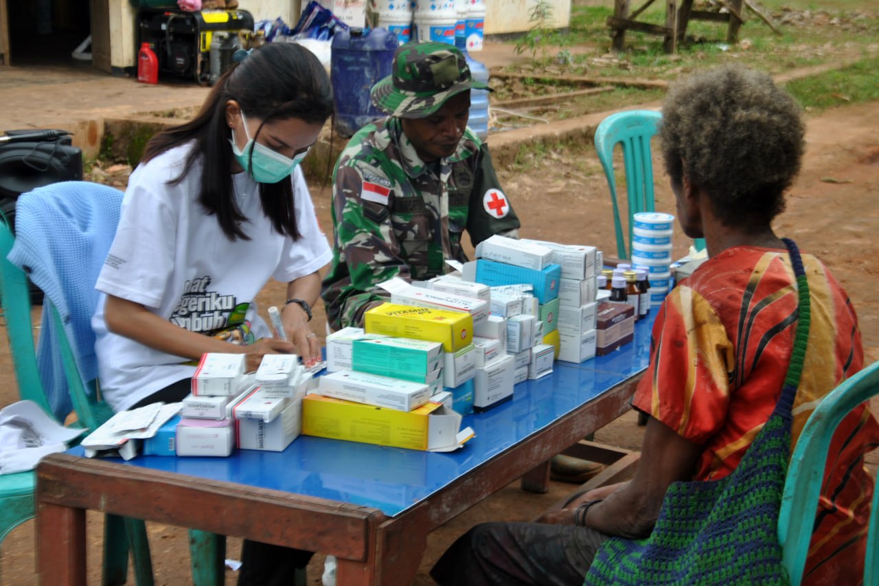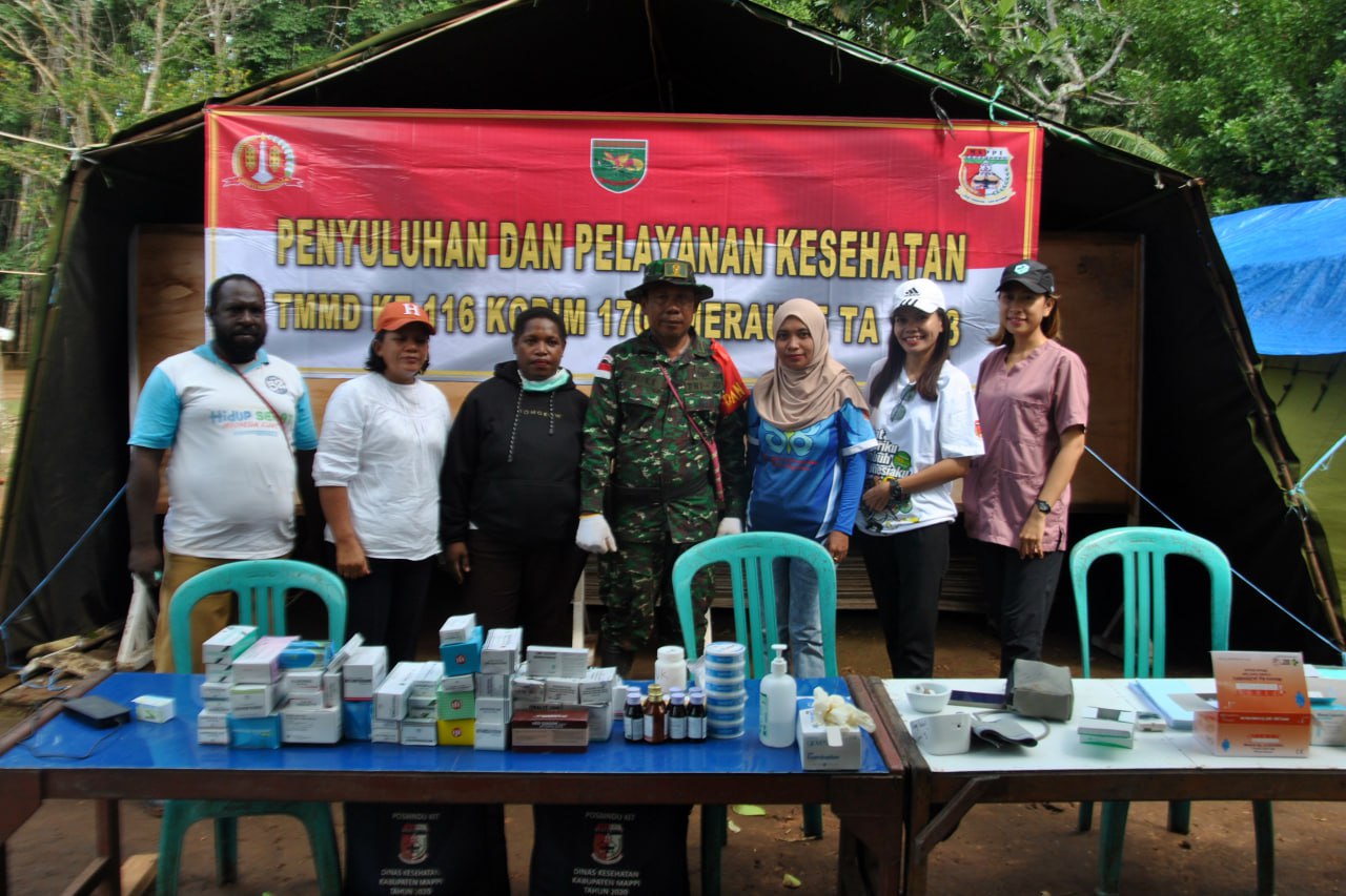 Dengan menggandeng petugas kesehatan Puskesmas Bade Distrik Edera Kabupaten Mappi - Papua Selatan, personel Satgas TMMD Ke-116 Kodim 1707/Merauke yang dipimpin langsung oleh Komandan SSK Satgas TMMD Ke-116 Kodim 1707/Merauke Lettu Inf Antonius Kalambia memberikan pelayanan kesehatan secara gratis kepada masyarakat Kampung Homlikya. Sabtu (27/5/23).