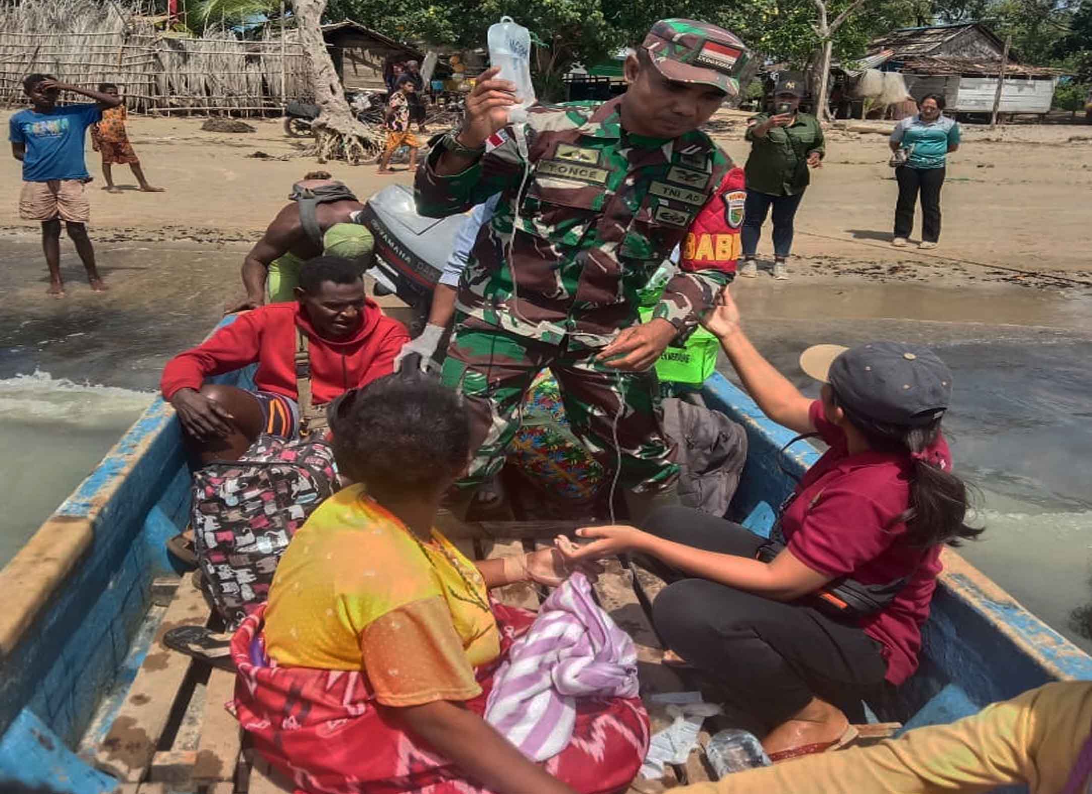 Peduli terhadap kesehatan dan keselamatan masyarakat di wilayah teritorialnya, Babinsa Kampung Yowied Koramil 1707-03/Okaba Kodim 1707/Merauke Serda Yosep Tonce bersama petugas kesehatan Puskesmas Tubang mengevakuasi pasien emergency Ibu Hamil (Goreti Irianti Lakeran) dari Puskesmas Tubang dirujuk ke RSUD Kab. Merauke. Senin (14/10/2024).