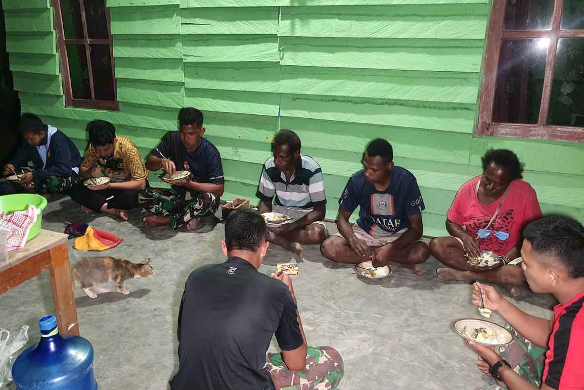 Menariknya, acara makan bersama ini dilaksanakan secara bergantian di rumah-rumah warga. Hal ini sengaja dilakukan agar personel Satgas benar-benar membaur dan tidak membeda-bedakan seluruh lapisan masyarakat. Kehangatan pun terasa saat hidangan lokal khas Papua tersaji di tengah obrolan ringan yang penuh canda dan tawa.