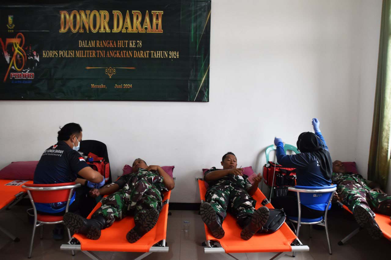 Dalam rangka Hari Ulang Tahun Ke-78 Korps Polisi Militer TNI Angkatan Darat Tahun 2024, Puluhan personel Kodim 1707/Merauke yang dipimpin langsung oleh Serma Dwi Surya mengikuti donor darah bertempat di Kantor Denpom XVII/3 Merauke Jln. Raya Mandala Distrik Merauke Kabupaten Merauke - Papua Selatan. Jum'at (7/6/2024).