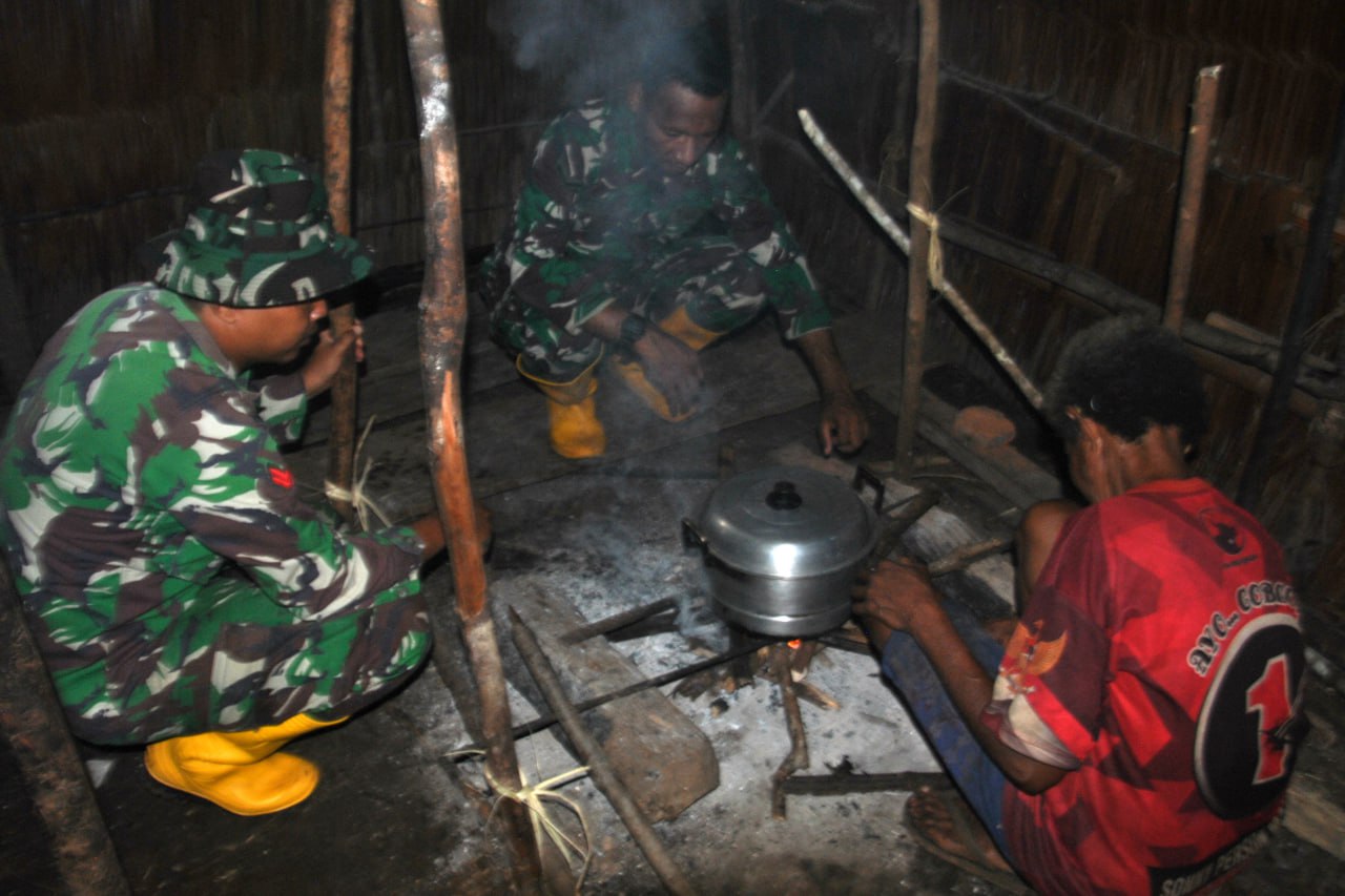 "Salah satu kedekatan personel Satgas TMMD Ke-116 dengan masyarakat Kampung Homlikya nampak saat mereka melaksanakan masak dan makan bersama di rumah pasangan Bapak Egidius Aun dan Ibu Eleneria". ungkap Dandim 1707/Merauke pada hari Jum'at tanggal 19 Mei 2023.