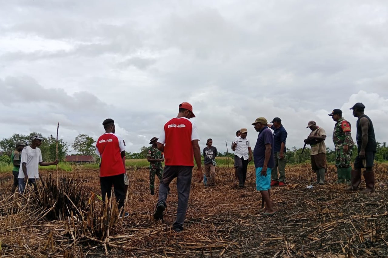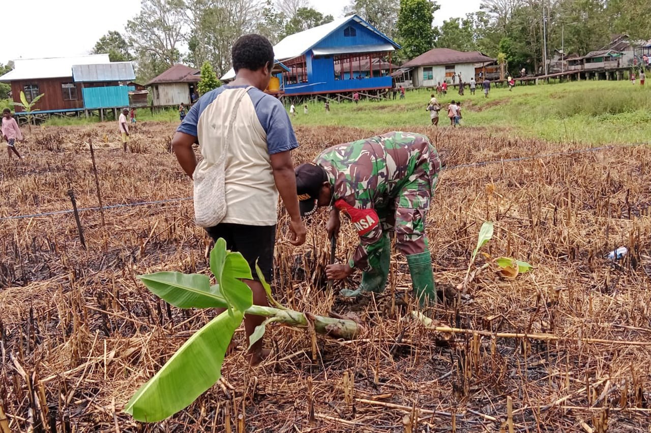 Babinsa Koramil 1707-20/Suator Kodim 1707/Merauke Serka Piter Awak dan Prada Frengki Murib bersama masyarakat Kampung Binam Distrik Suator Kabupaten Asmat melaksanakan kerja bhakti penanaman pohon pisang.