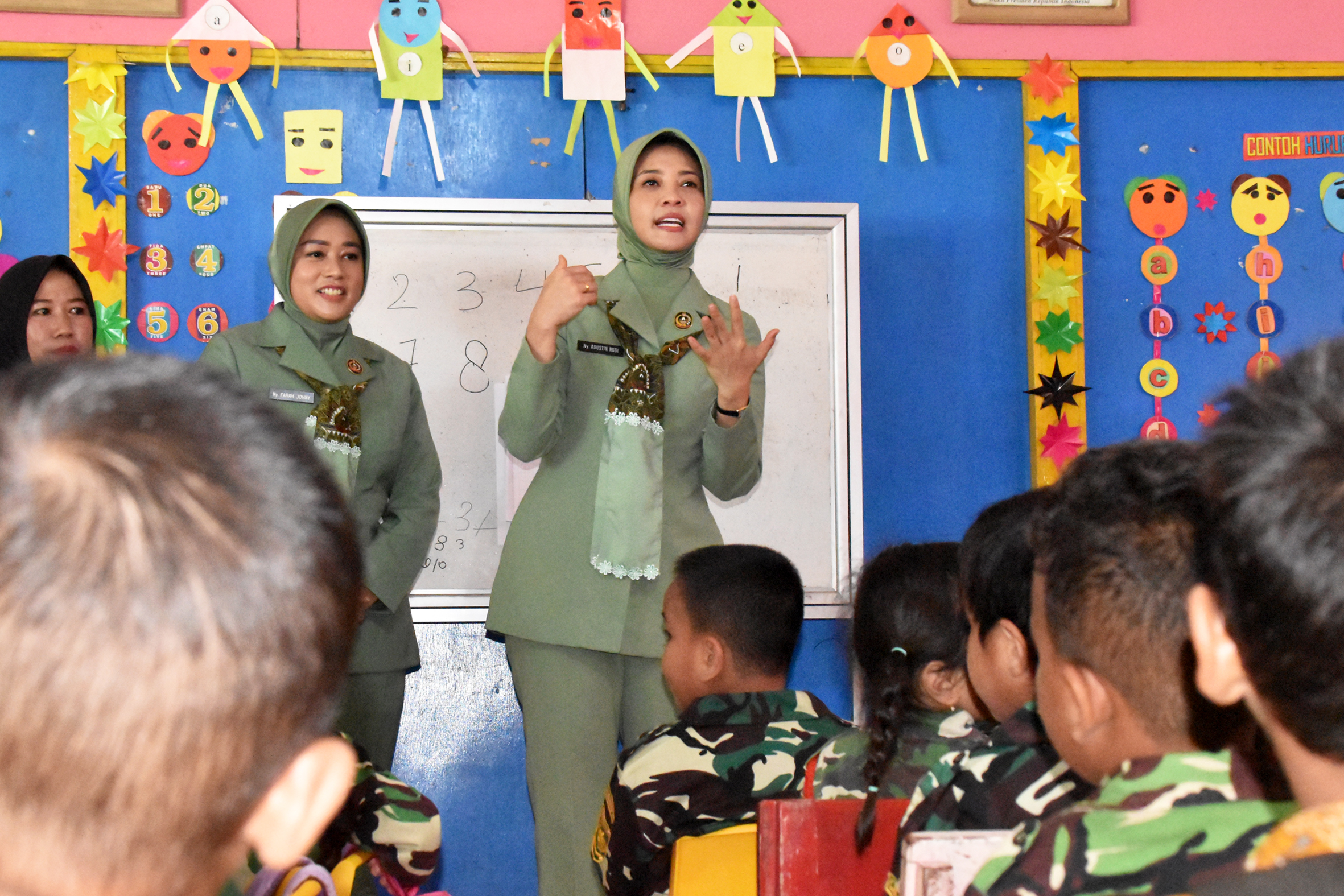 Dalam kunjungan tersebut, Ny. Agustin tidak hanya sekadar hadir, namun terlibat aktif berinteraksi dengan anak-anak. Ia mengajak mereka bercerita, menyanyikan lagu-lagu kebangsaan seperti “Hari Merdeka” dan lagu anak-anak “Pelangi-Pelangi”, serta mendengarkan puisi bertema kasih sayang kepada orang tua. Suasana makin meriah ketika anak-anak membawakan yel-yel semangat khas TK Kartika VI-9.