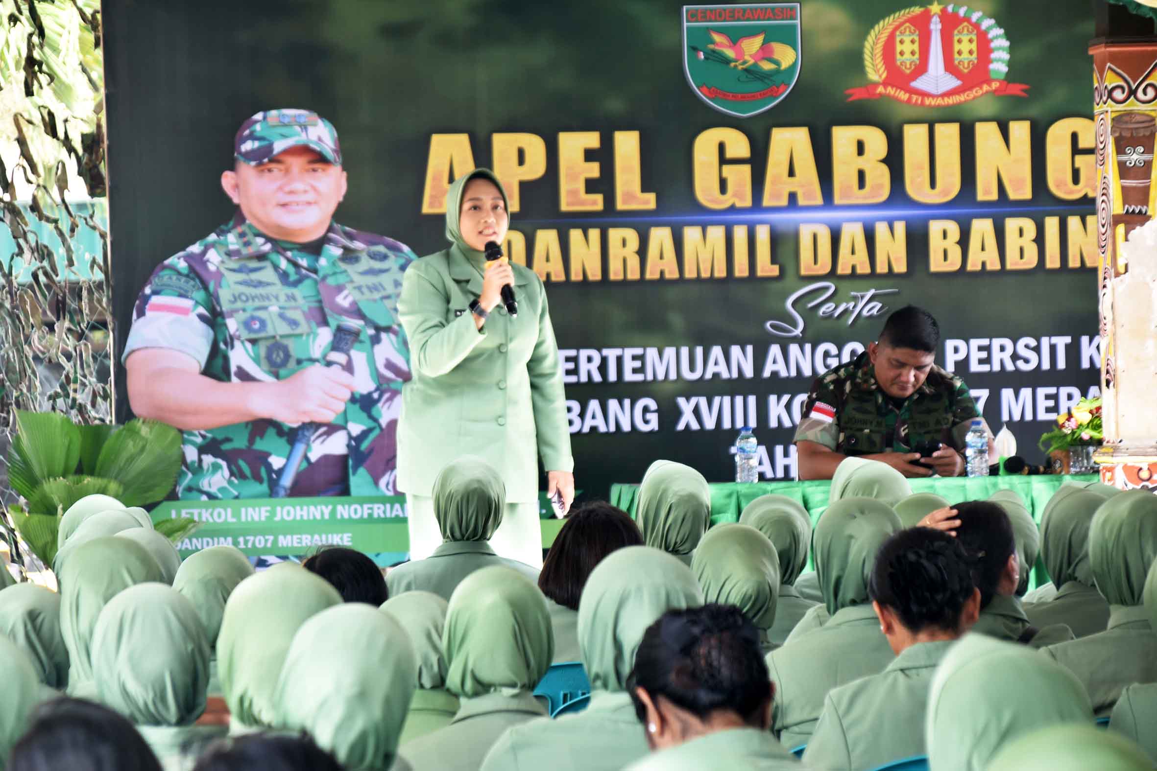 Komandan Kodim 1707/Merauke Letkol Inf Johny Nofriady, S.E., M.Han dengan didampingi Ketua persit Kartika Chandra Kirana Cabang XVIII Kodim 1707/Merauke Ny. Farah Johny Nofriady memimpin Apel Gabungan Danramil dan Babinsa serta pertemuan Anggota Persit KCK Cabang XVIII Kodim 1707/Merauke Tahun 2024.