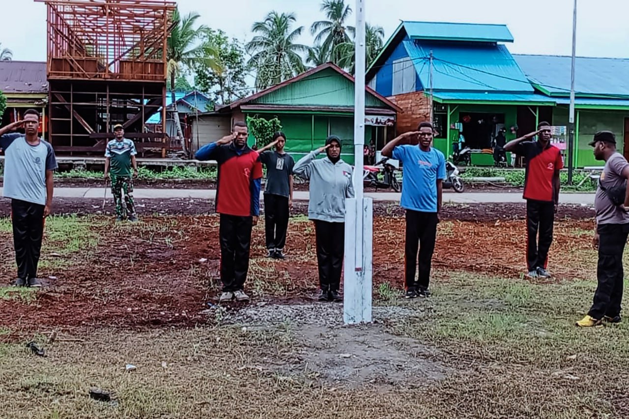 Dalam rangka memantapkan para calon Paskibra untuk upacara bendera pada HUT Kemerdekaan Republik Indonesia Ke-78 Tahun 2023 di Distrik Atsj, Babinsa Koramil 1707-19/Atsj Kodim 1707/Merauke Serka Laode Sudirman dan Serda Tantinus bersama Bhabinkamtibmas Polsek Atsj memberikan pelatihan tentang tatacara mengibarkan bendera.