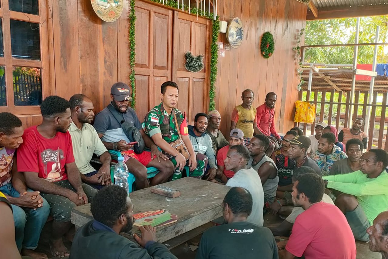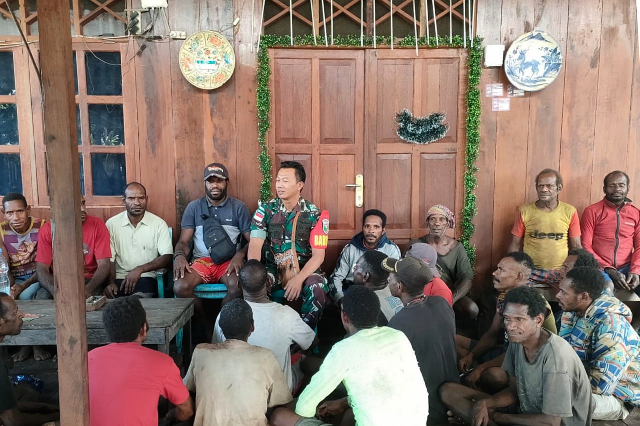 Babinsa Koramil 1707-12/Sawaerma Kodim 1707/Merauke Pelda Indarwanto mengajak masyarakat Kampung Pupis Distrik Sawaerma Kabupaten Asmat - Papua Selatan untuk bersama-sama menjaga keamanan dan ketertiban wilayah.