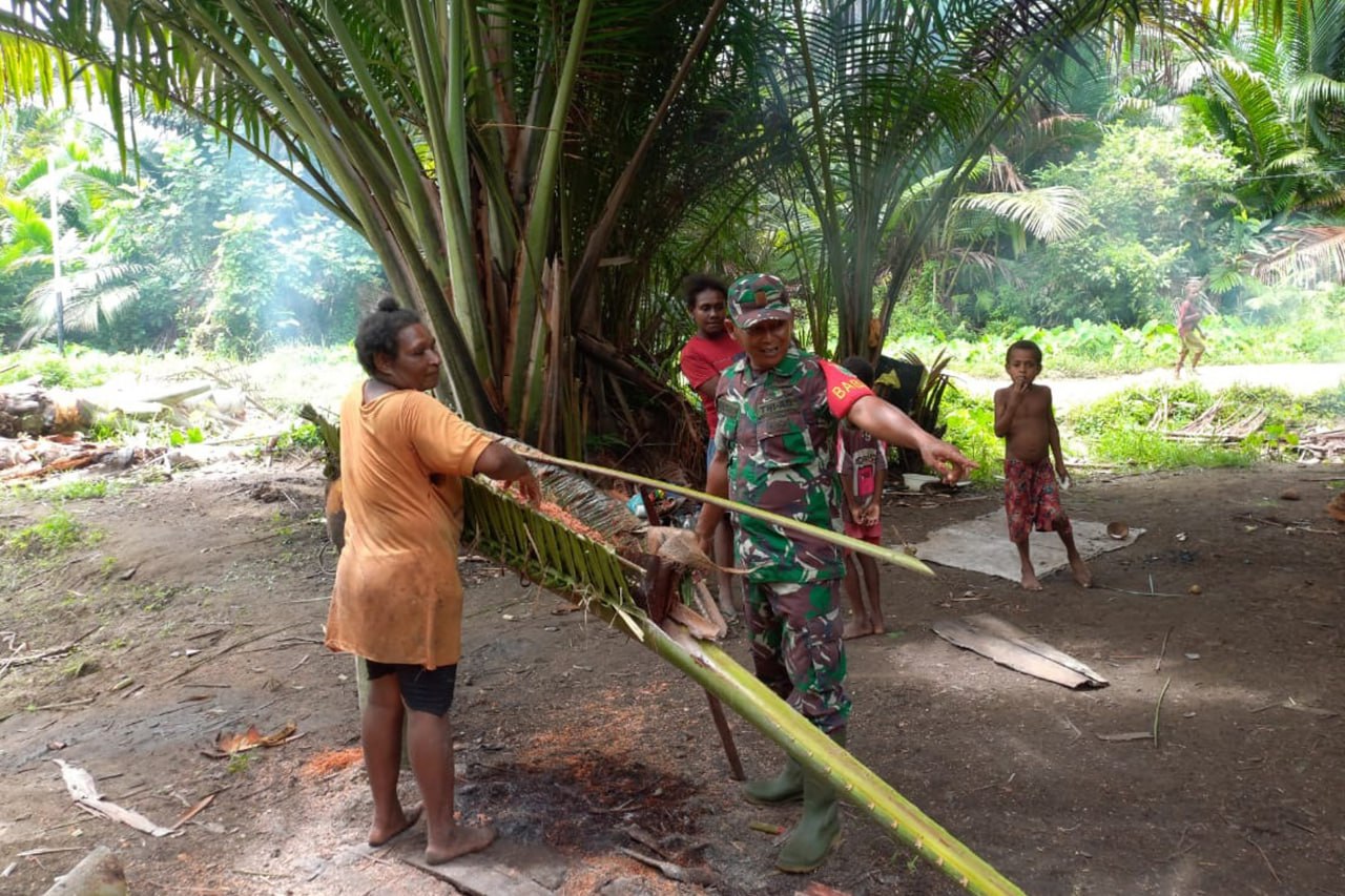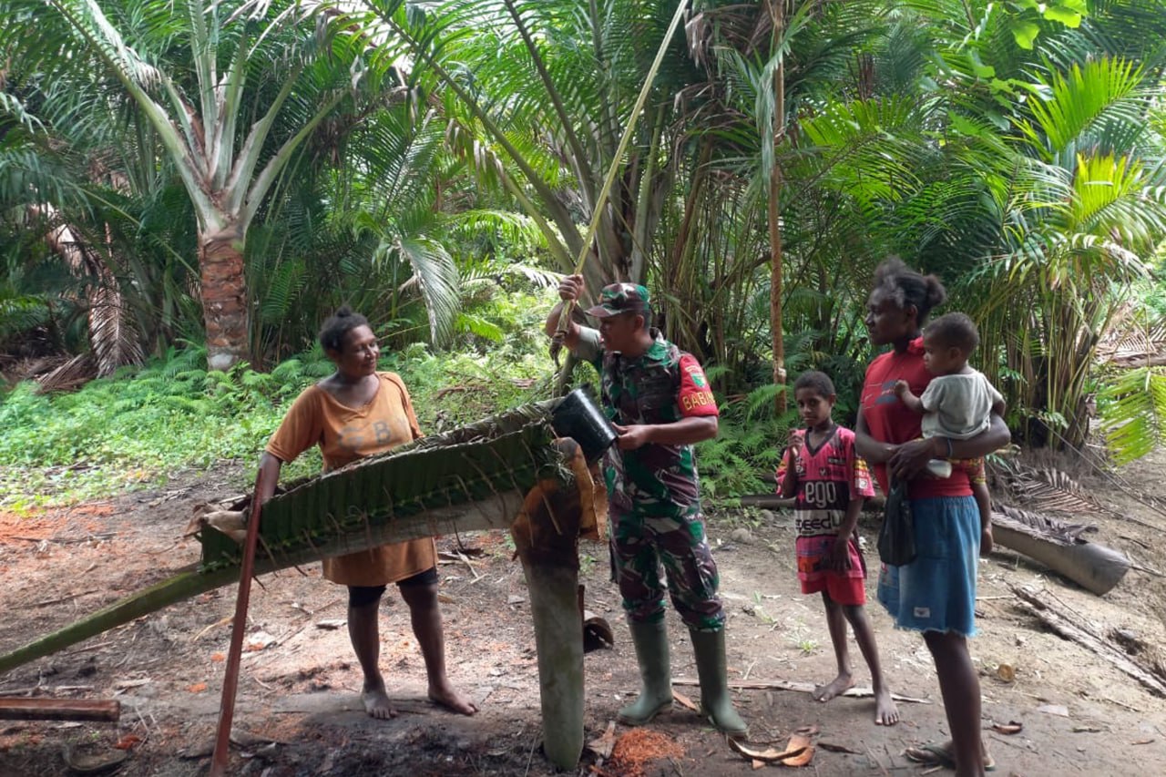 Kegiatan anjangsana yang dilakukan Babinsa Koptu Mulyadi tersebut dimanfaatkan untuk membantu keluarga Ibu Herlina Mahuze dalam mengolah sagu di kebun miliknya mulai dari pengambilan air bersih hingga mengambil sari pati sagu.