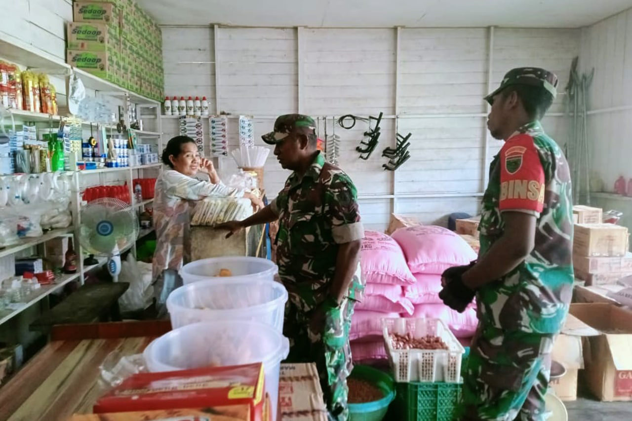 Dalam rangka ikut serta menjaga kesehatan dan ketertiban bagi masyarakat di wilayah teritorialnya, Babinsa Koramil 1707-20/Suator Kodim 1707/Merauke Serka Pieter Awak dan Prada Isak Manggobo melaksanakan komunikasi sosial dengan para pemilik kios di wilayah Distrik Suator Kabupaten Asmat terkait tentang barang dagangan/bahan makanan yang dijual. Senin (26/9/2022).