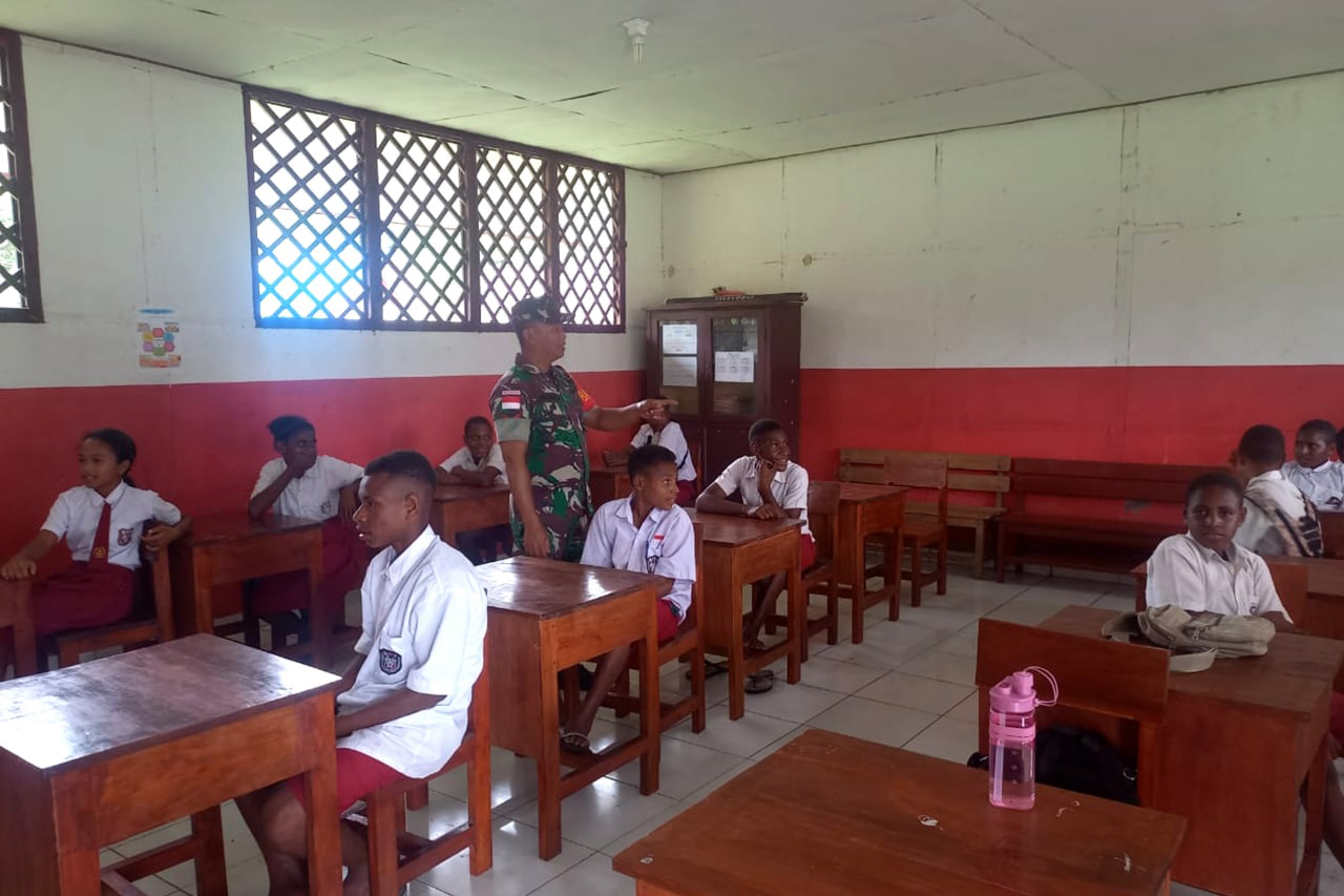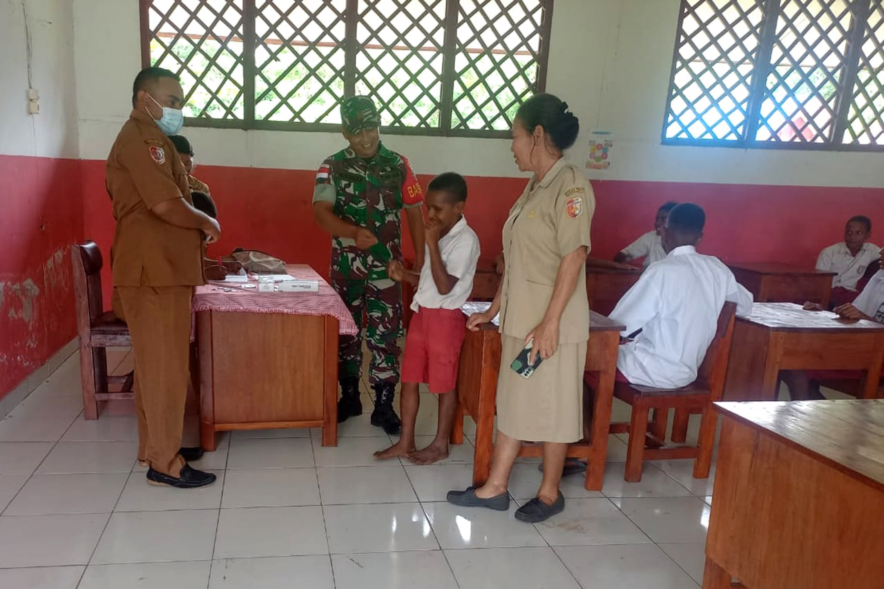 Bertempat di Sekolah Dasar YPK Okaba Distrik Okaba Kabupaten Merauke, Babinsa Koramil 1707-06/Okaba Kodim 1707/Merauke Koptu Muliyadi melaksanakan pendampingan kepada siswa-siswi Sekolah Dasar YPK Okaba dalam menerima vitamin dari petugas kesehatan Puskesmas Okaba. Senin (5/9/22).