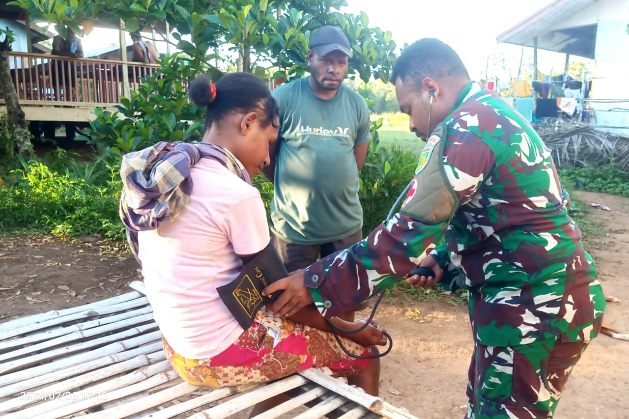 Selain melaksanakan kegiatan fisik, tim kesehatan yang tergabung dalam Satgas TMMD Ke-119 Kodim 1707/Merauke juga melaksanakan aksinya yaitu memberikan pelayanan kesehatan secara gratis kepada masyarakat Kampung Po Epe. Senin (26/2/2024).