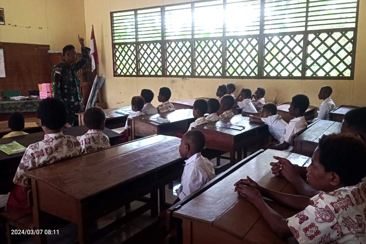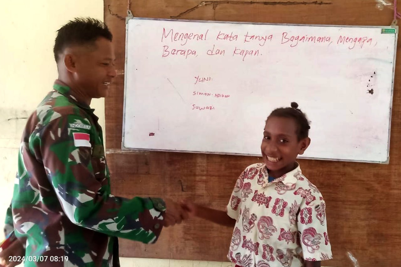 Seperti yang dilakukan oleh Sertu Juwari, ia ikut membantu mengajar di Sekolah Dasar YPK Po Epe dalam rangka membantu pihak sekolah dalam mencerdaskan siswa-siswi Kampung Po Epe. Kamis (7/3/2024).