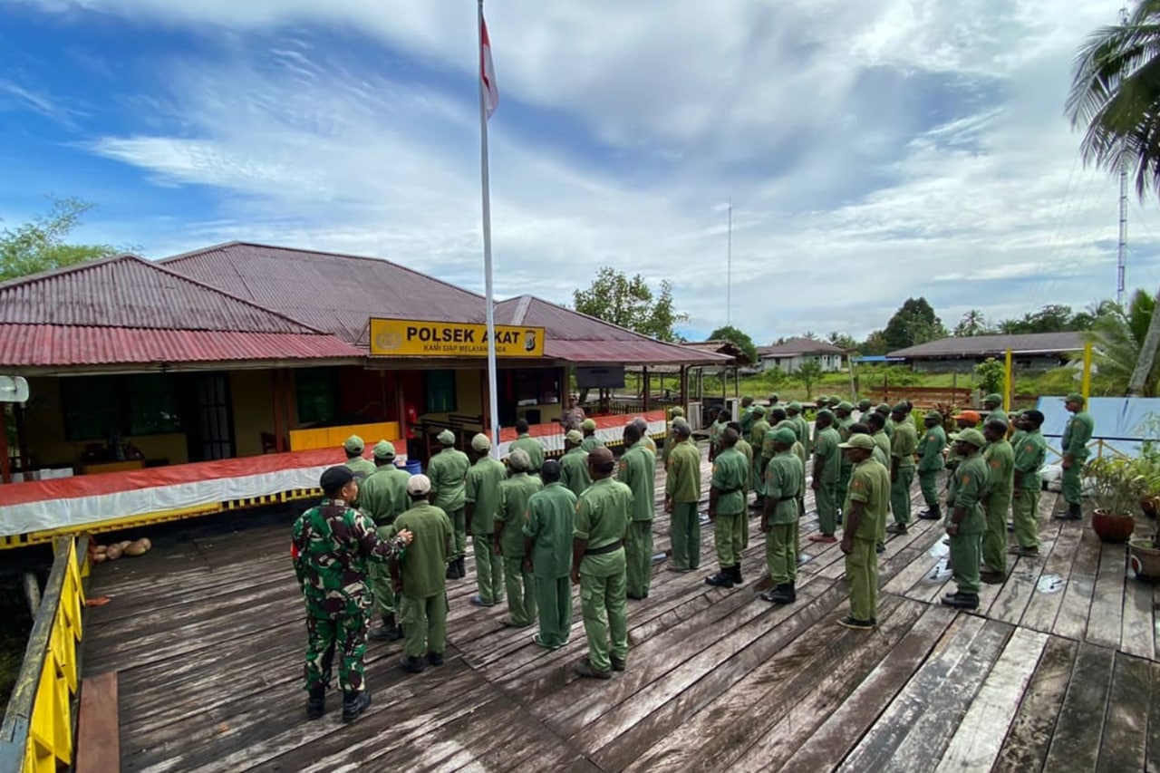 Bertempat di Halaman Polsek Akat Jln. Bakar Saitaw Kampung Ayam Distrik Akat Kabupaten Asmat, Babinsa Koramil 1707-08/Agats jajaran Kodim 1707/Merauke Serda Tomy Dwi Cahyono dan Bhabinkamtibmas Polsek Akat Bripka Elentius L.M. memberikan pelatihan dan pembinaan kepada puluhan Linmas Distrik Akat Kabupaten Asmat.