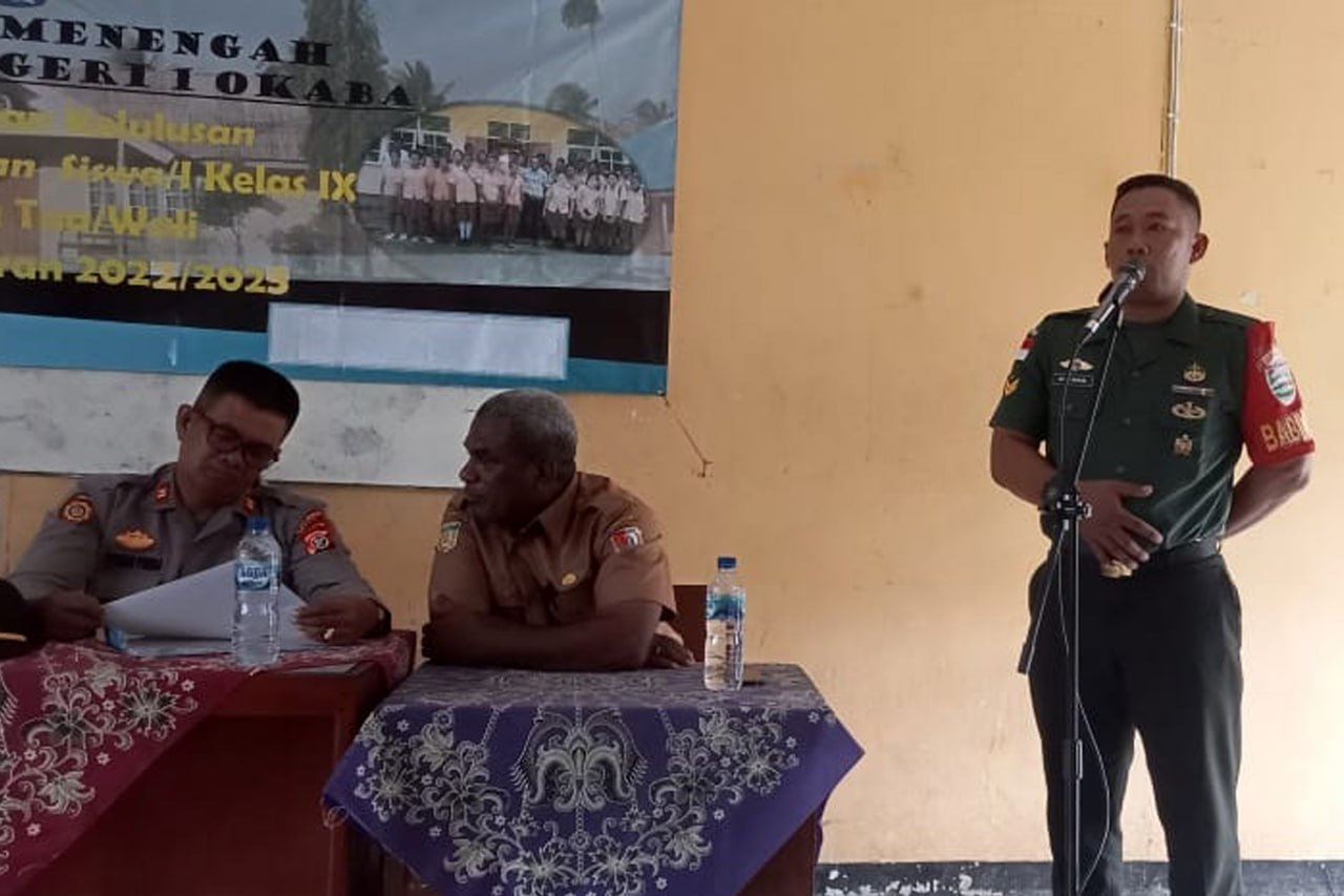 Babinsa Koramil 1707-06/Okaba Kodim 1707/Merauke Sertu Irsam Maming selaku Ketua Komite Sekolah SMP Negeri 1 Okaba memberikan pengumuman kelulusan bagi siswa-siswi SMP Negeri 1 Okaba bertempat di Aula SMP Negeri 1 Okaba Distrik Okaba Kabupaten Merauke - Papua Selatan.