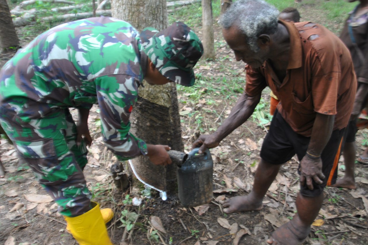 Demikian pula hal yang sama juga dilakukan oleh personel Satgas TMMD Ke-116 di sela-sela kegiatan TMMD ikut membantu warga setempat melaksanakan pekerjaannya sehari-hari seperti memangkur sagu dan menyadap getah karet untuk meringankan beban tenaga guna memenuhi kebutuhan sehari-hari.