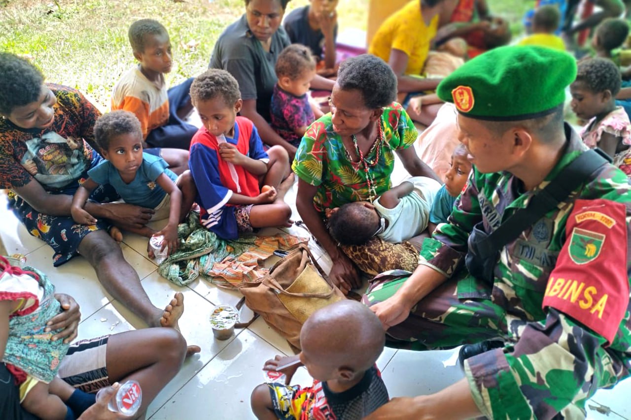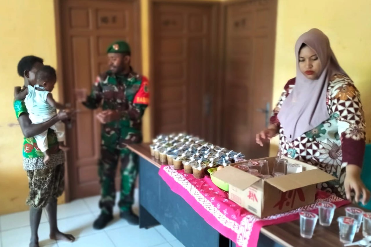 Dalam ikut serta menurunkan angka stunting, Babinsa dan Persit Koramil 1707-09/Kimaam Kodim 1707/Merauke memberikan makanan tambahan kepada anak stunting di Kampung Kiworo Distrik Kimaam Kabupaten Merauke - Papua Selatan.