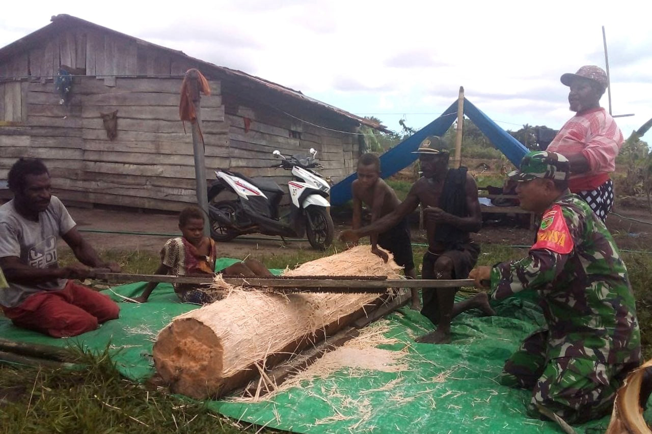 Bertempat di Halaman Rumah Bapak Libertus Kaimudi salah satu masyarakat Rt.05/Rw.03 Kampung Candra Jaya Distrik Kurik Kabupaten Merauke, Babinsa Koramil 1707-05/Meruake Kodim 1707/Merauke Sertu Muhamad Arif membantu keluarga Bapak Libertus Kaimudi memangkur sagu untuk dijadikan makanan pokok. Jum'at (9/9/22).
