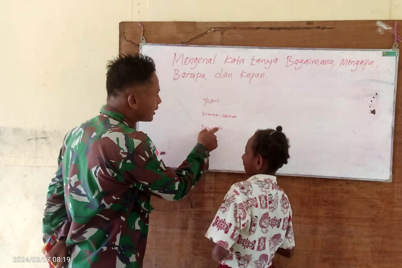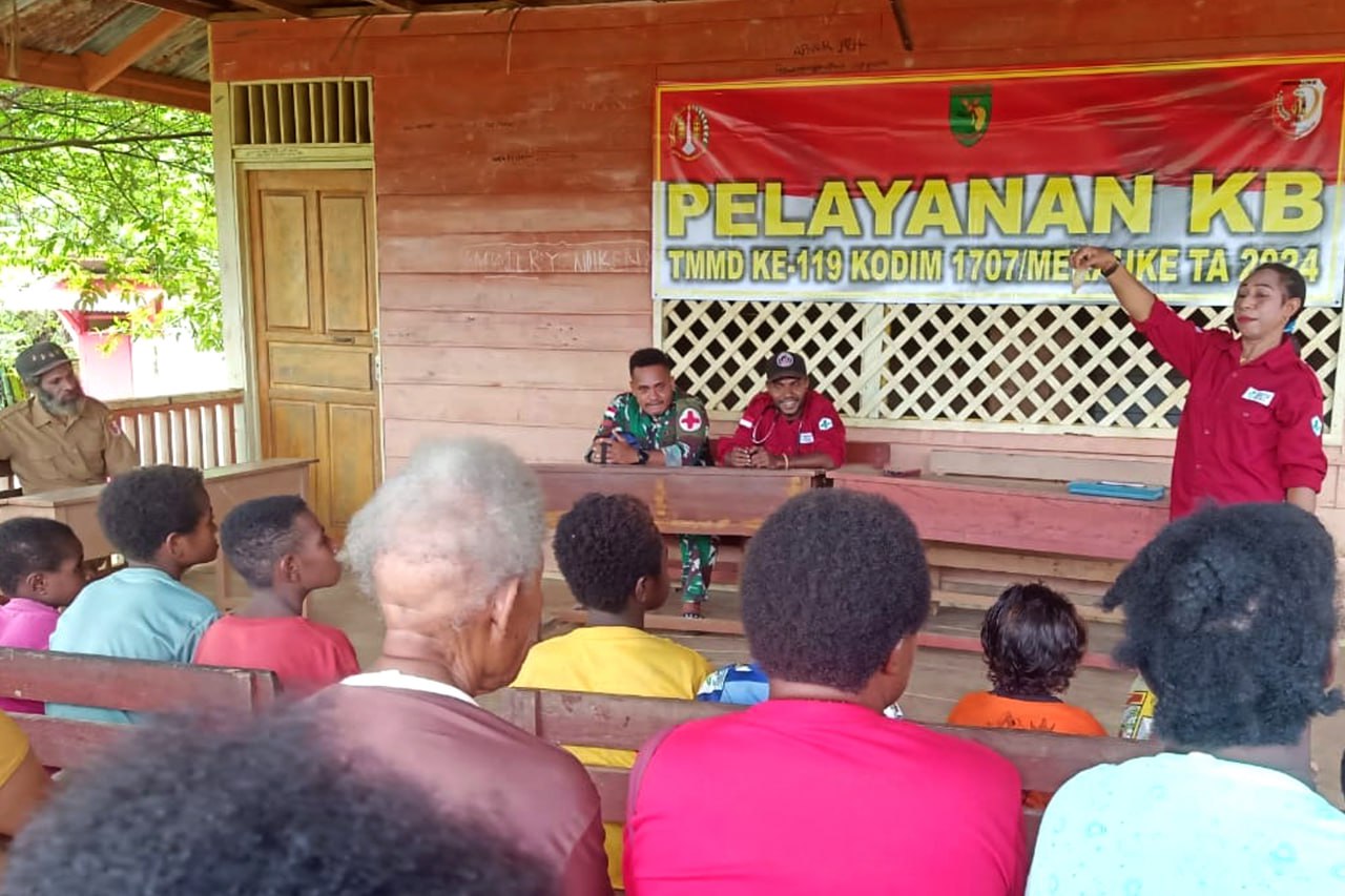 Dengan menggandeng petugas kesehatan Puskesmas Ngguti, personel Satgas TMMD Ke-119 Kodim 1707/Merauke yang dipimpin langsung oleh Komandan SSK Satgas TMMD Ke-119 Lettu Inf Abdullah Latupono, S.Sos memberikan penyuluhan . . . 0