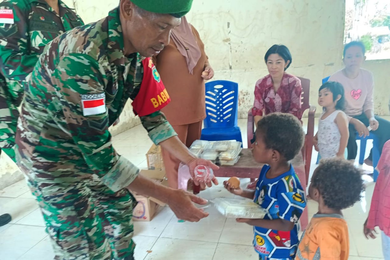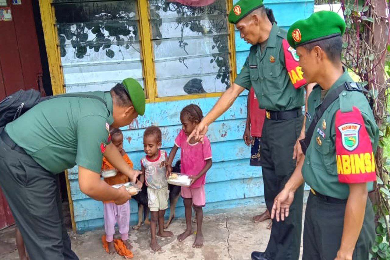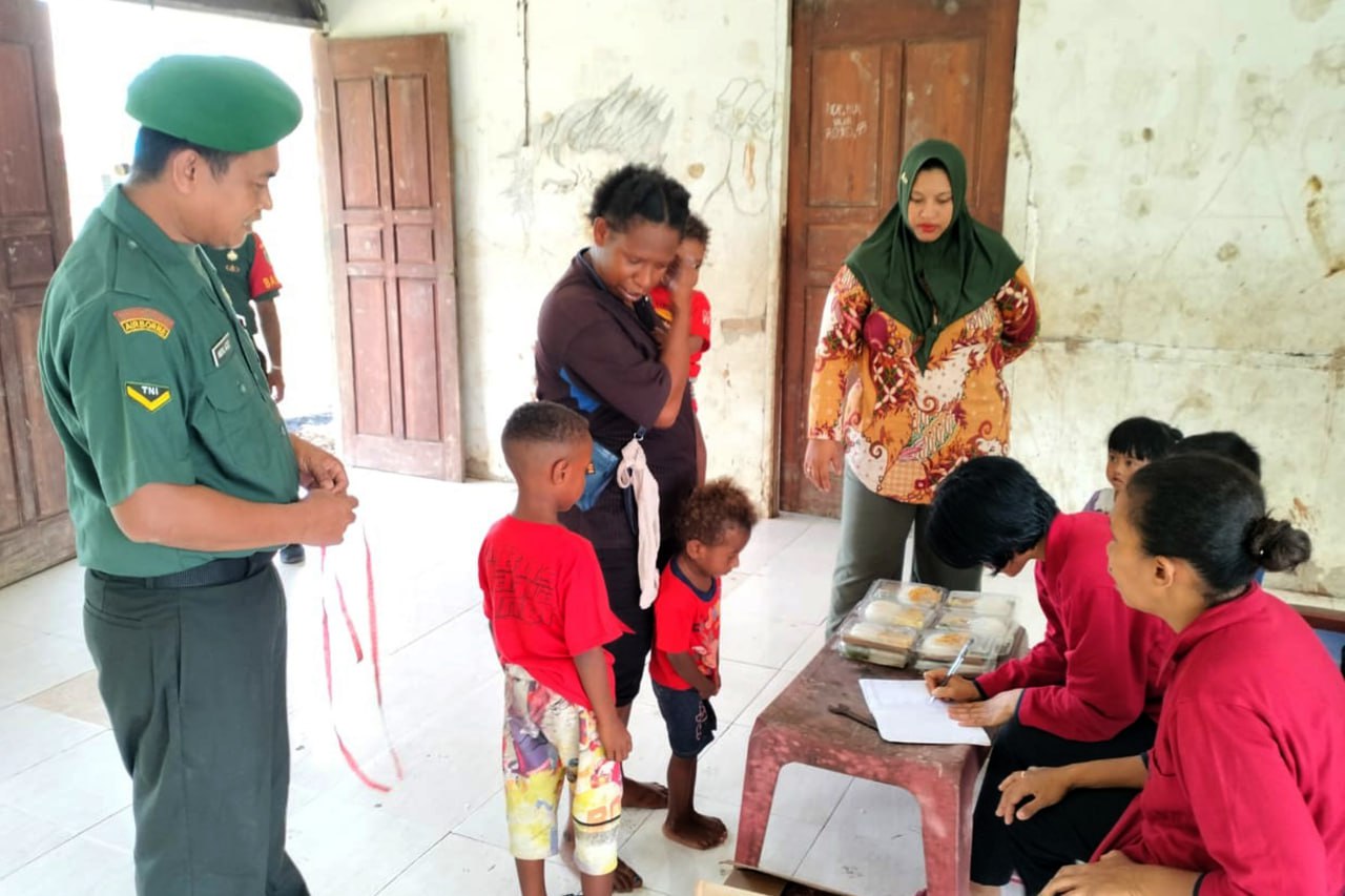 Babinsa Koramil 1707-04/Kimaam Kodim 1707/Merauke yang dipimpin langsung oleh Danramil 1707-04/Kimaam Kapten Inf Nurmadi melaksanakan kegiatan Pemberian Makanan Tambahan (PMT) kepada anak-anak Kampung Kiworo Distrik . . . 0