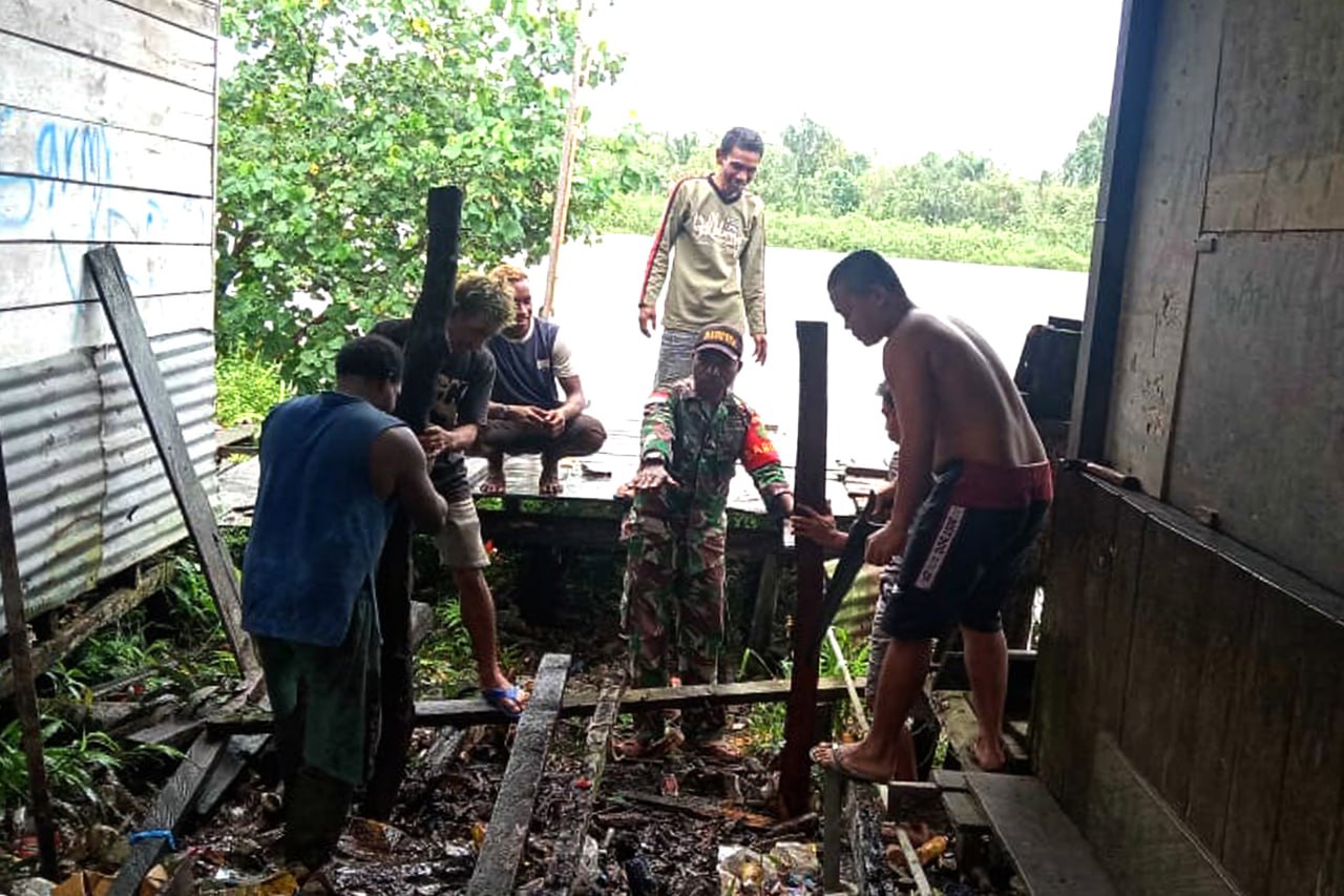 Babinsa Koramil 1707-07/Kepi Kodim 1707/Merauke Sertu Nur Rofi'i membantu petugas kebersihan jalan Kab. Mappi dalam membersihkan sampah di jalan KM.05 Kepi Distrik Obaa Kabupaten Mappi - Papua Selatan. Rabu . . . 0