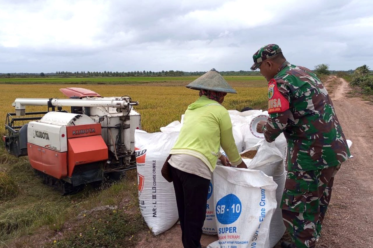 BABINSA POS RAMIL KURIK BANTU PETANI KAMPUNG CANDRA JAYA MEMANEN PADI