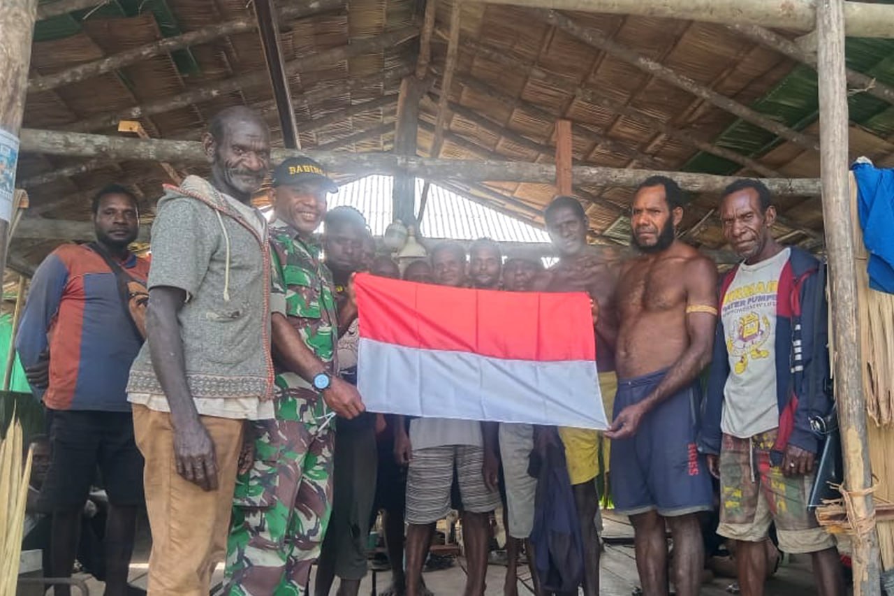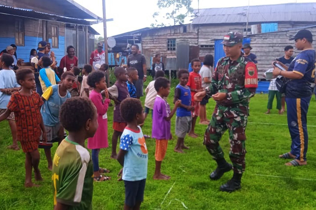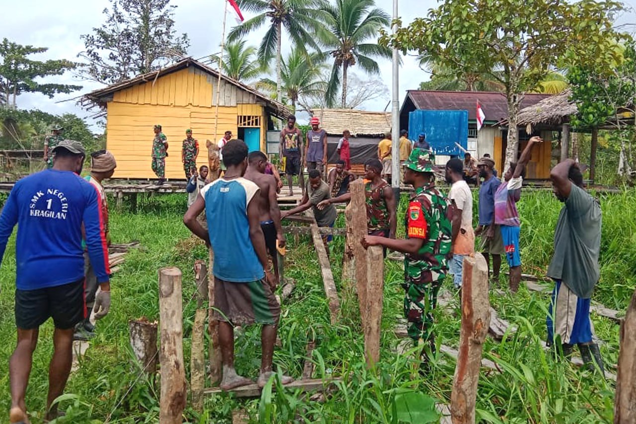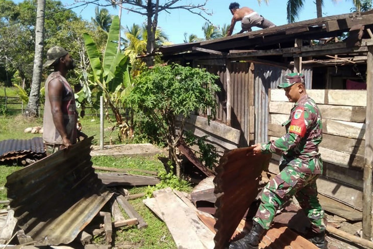 Babinsa Koramil 1707-06/Okaba Kodim 1707/Merauke Sertu Dwi Indarwanto membantu keluarga Bapak Sidra Kiring salah satu masyarakat Kampung Okaba Distrik Okaba Kabupaten Merauke - Papua Selatan memperbaiki atap rumahnya. . . . 0
